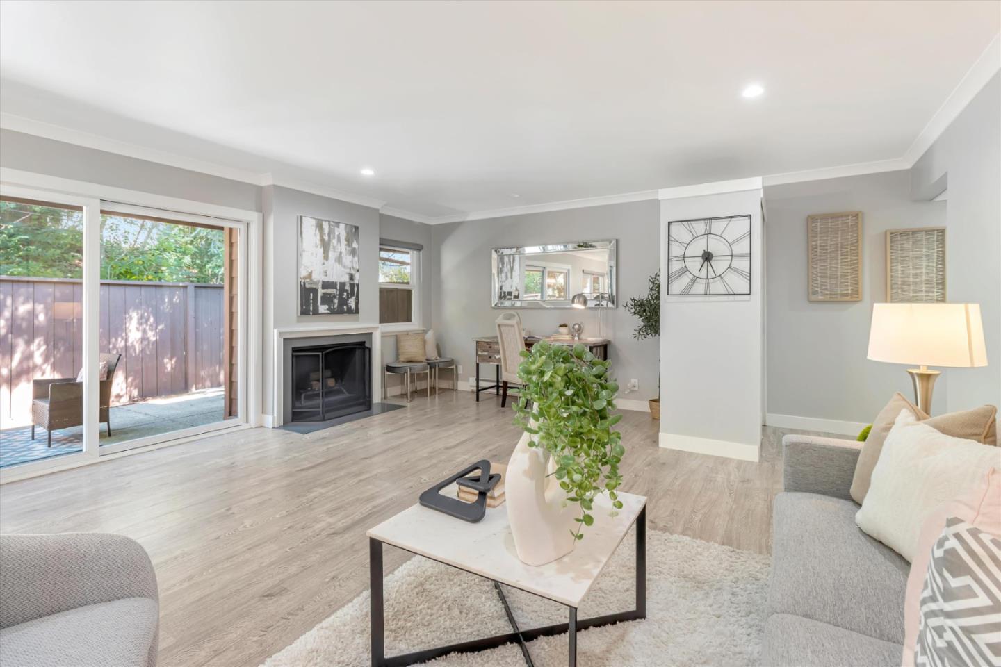 Welcome to this updated single-story townhome-style condo in highly sought-after Willow Park, with no neighbors above or below you. This spacious, freshly painted, 740 sq. ft. condo has a large private backyard, with no neighbors behind you, and a patio that is surrounded by gorgeous redwood trees. The large open living room has a wood burning fireplace, an office/play area, and a sitting/gathering area. Kitchen features quartz countertops, stainless-steel appliances, and skylight. Bathroom has a shower above tub with a glass enclosure, new exhaust fan, and tile floor. Generously sized bedroom has wall-to-wall closet and a laundry closet with full-sized stackable washer/dryer. Additional upgrades include laminate floors, recessed lights, new dual-paned windows/double sliding glass door, new permitted electrical panel, new closet doors in the entry way and hallway, new chandelier, and insulation in the attic. Complex amenities include pool, clubhouse, and EV Charging Stations. Just blocks to downtown Mountain View, with Farmer's Market, shops, restaurants, CalTrain, and Light Rail. Easy access to major employers, Stevens Creek Trail, and highways 85, 237,101. Twilight Open House on Friday, 4/7, from 4:30 - 6:30pm. Open Houses Saturday, 4/8, and Sunday, 4/9, from 1:30 - 4:30pm.