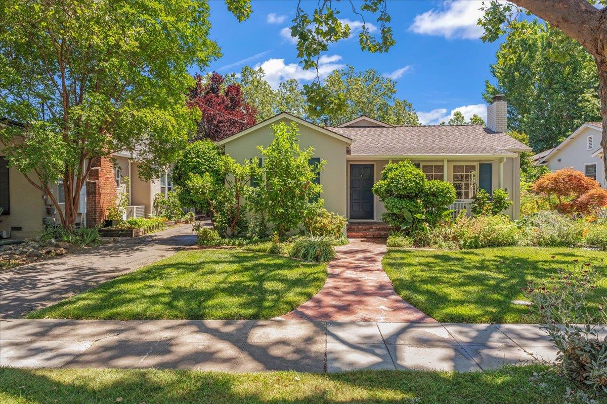 Nestled in the heart of Willow Glen, this charming old-world style bungalow offers bright living spaces flooded with natural light. The foyer opens to a spacious living room with a brick fireplace. An arched doorway leads to the formal dining area, ensuring seamless flow. Gourmet kitchen features a casual dining nook, built-in buffet, vintage O'Keefe and Merritt range and matching range hood. The basement off the kitchen is hidden by a pocket door and doubles as the utility area with washer and dryer. Formal dining area through the architectural arched doorway from living room features lovely garden views. Primary bedroom with French doors to circular brick patio and dual closets. Bedroom 2 features gorgeous hardwood, and Box Sash windows. Bedroom 3 makes the perfect office with French door to yard, walk in closet with built-ins, and custom cabinetry. A Full bathroom with timeless design features separate shower and tub, and pedestal sink, plus a 1/2 bath with charming pedestal sink. Complemented by gleaming hardwood floors throughout, and Cased Box Sash windows highlight the Craftsman style. Outside, a detached 2-car garage, stunning front landscaping, and lush rear grounds with a brick patio and pergola. Close downtown Willow Glen with shopping, fine dining, and coffee shops