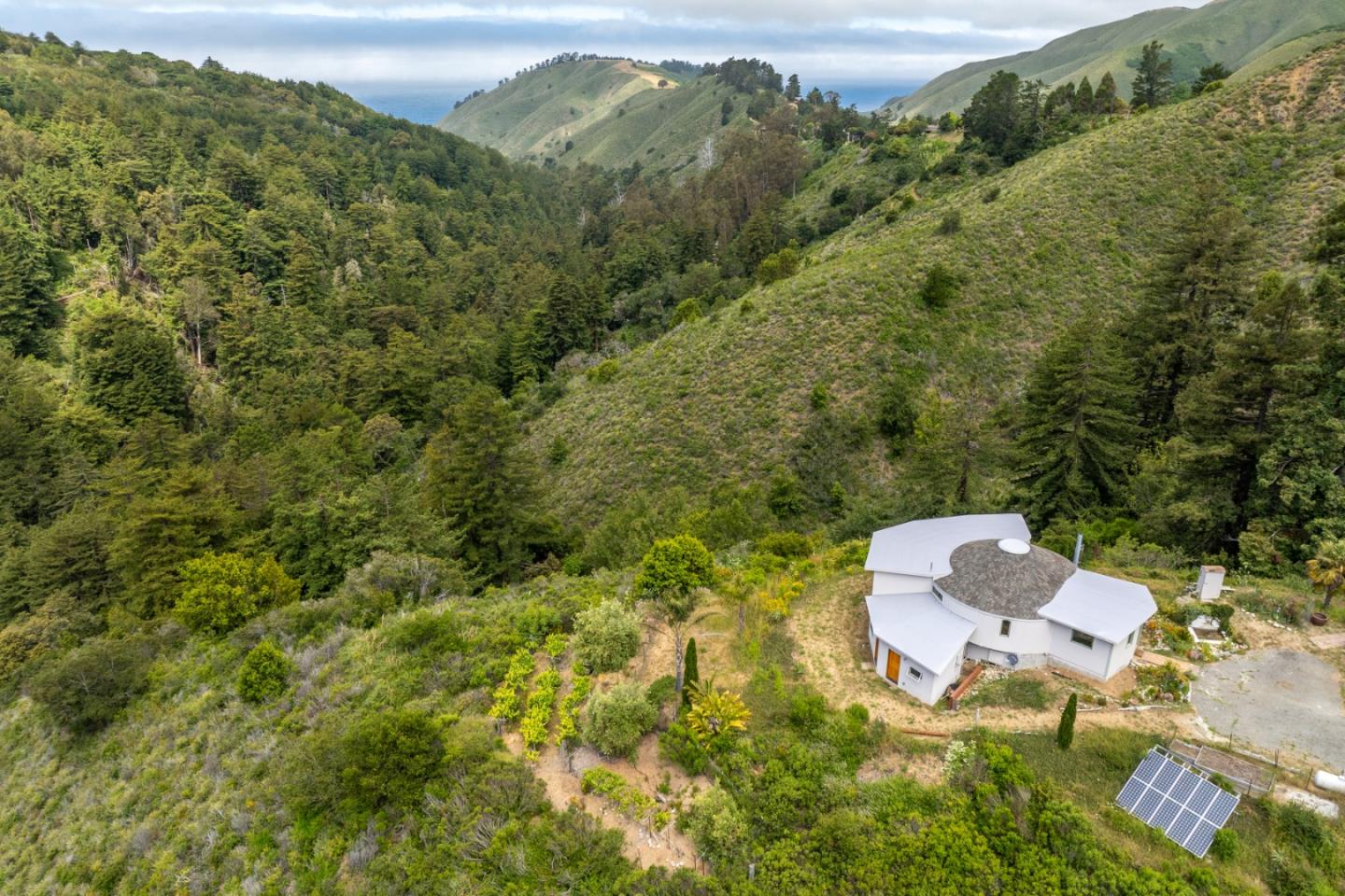 Sitting high atop a mountain overlooking Palo Colorado Canyon and the Pacific ocean beyond, this home is magical. Easily accessed by a paved road, the property features two separate sites within the 8+acre parcel, both with magnificent views: one with an artists studio and large storage shed on public power, and the other, a round house completely off-grid. Main level of house is open concept, with kitchen, living, sleeping area and bathroom on that level. Separate downstairs has laundry room, second bathroom and two bedrooms all framed in and ready for finish carpentry. All construction is fully permitted through Monterey County. Beloved by the current owners for 37 years, the home, which sits in a sunbelt, is lush with gardens, small vineyard and a beautiful fountain near the front door. Gorgeous, unobstructed views.