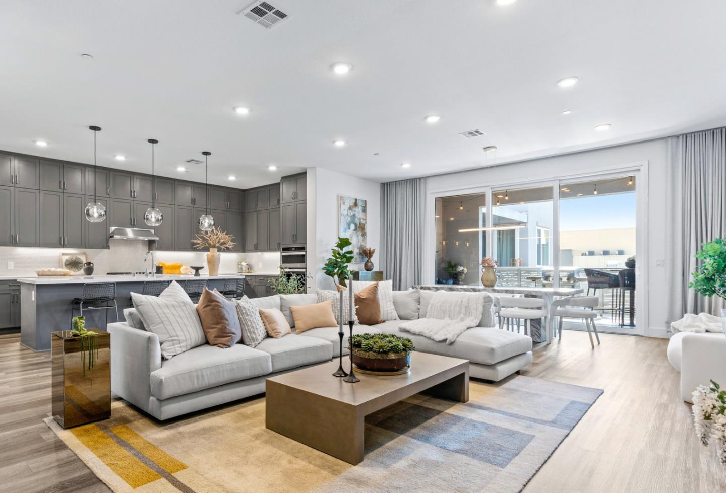 Experience California penthouse living in this 4-year-old, single-story luxury condo. Situated on the top floor, this corner unit home offers maximum natural light, privacy & courtyard views. With only 4 units on the top floor, exclusivity is guaranteed. The chefs kitchen features ceiling-height custom cabinets, built-in SST appliances & a gigantic quartz island w/ breakfast bar. The open-concept great room, boasting a 10 ceiling, is ideal for entertaining. A glass multi-slider door seamlessly connects the great room to a covered patio, extending your outdoor entertaining space. Enjoy custom window treatments & designer light fixtures throughout. The luxurious primary suite & a spacious secondary bedroom each have private full baths. Primary suite features a generous bathroom w/ an extra-wide double sink vanity & a walk-in closet outfitted w/ custom-built California Closets, designed to accommodate all your wardrobe essentials. Underground parking includes two side-by-side spaces equipped w/ Level 2 EV charger. HOA $730/m includes garbage, resort-style amenities such as a two-story clubhouse w/ private event spaces, a fitness center & a swimming pool w/ Olympic lap lanes & cabanas. Conveniently located across from BART & Hwy, this home offers unparalleled convenience & luxury.