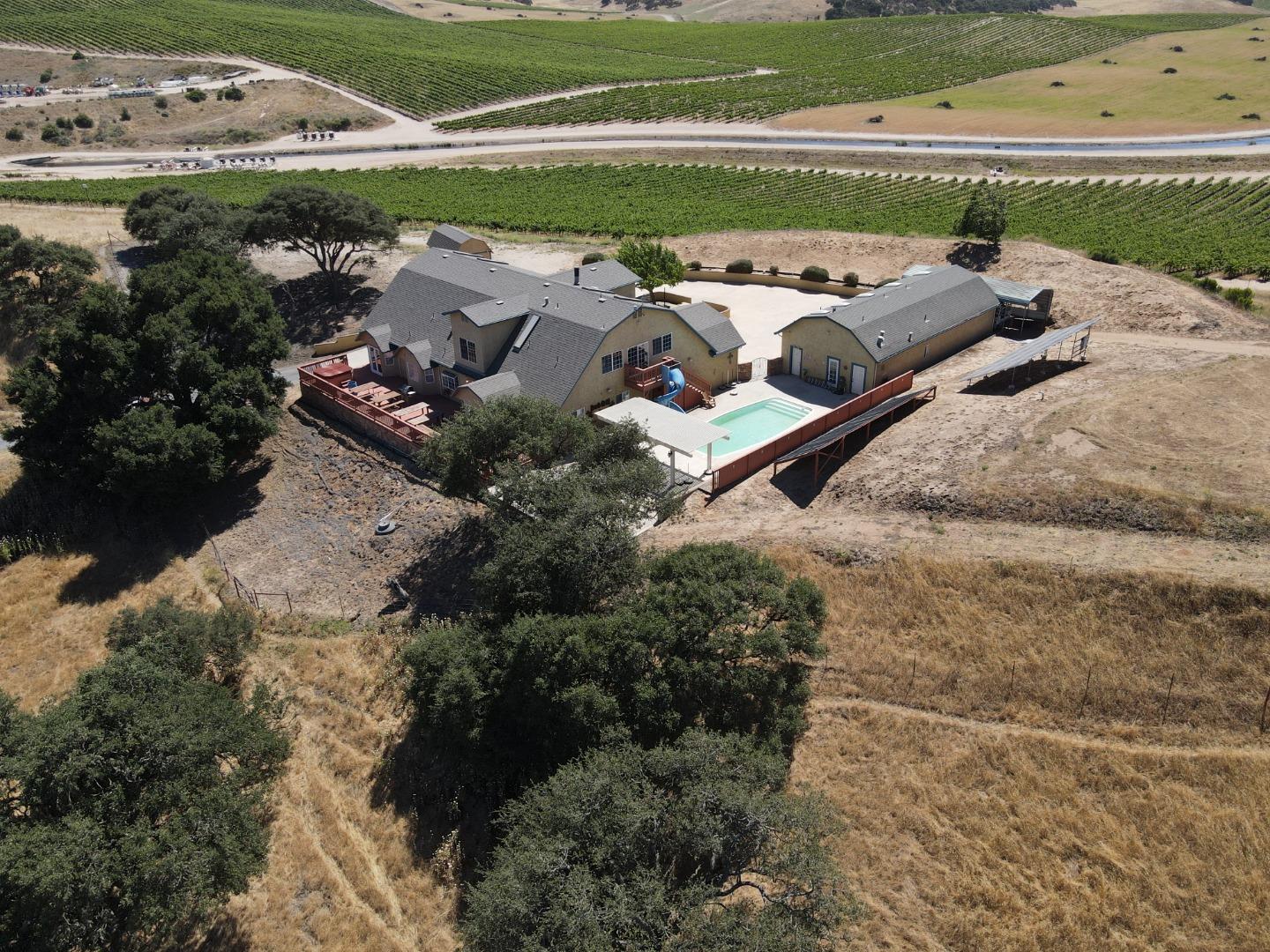 An exceptional opportunity to acquire your ranch property & home surrounded by vineyards & spectacular views! Situated just 6 miles from King City in South Monterey County is 34.5 aces & 4638 sf home! Enter this expansive home with an abundance of living room space were sunshine surrounds you & a wood burning fireplace! A huge kitchen, 2 dining areas. 4 bedrooms, 3 full baths, 1 half bath, office, large laundry/utility room all on the ground level, the primary bedroom has an electric fireplace. Upstairs is an entertainer's dream. Open spaces for pool table and games, a wet bar, gambling table & 2 half baths, access stairs down to the pool! The 34.5 acres is completely wire fenced for livestock, a seasonal pond, outbuilding to house your equipment, boat or motorhome. You won't find better views of vineyards, mountains and the valley. There is a small barn by the house for your 4-H animals. Cool off in the pool that is solar powered, a view patio plus another large deck, BBQ area, outdoor shower area & a pool slide! The garages house 6 spaces, a workshop & full bath & a half bath. The carport is large enough for an RV. Solar panels are owned. This property could be your country retreat that is only 1 hour from Paso Robles & Monterey-Carmel. Check this one out today!
