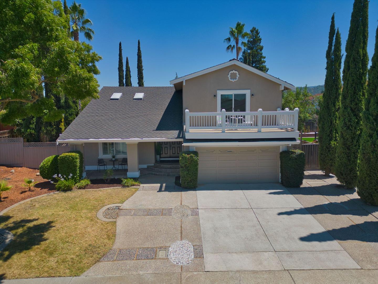 This stunning home nestled in the desirable Almaden Valley's Woodside neighborhood features 5 spacious bedrooms, including one on the ground floor plus a loft and three full baths. The home's impressive curb appeal is enhanced by a beautifully maintained exterior, a wide driveway, and a welcoming front porch. Inside, you'll find an open floor plan with a living room that boasts vaulted ceilings, hardwood flooring, recessed lighting and ample natural light from skylights. The kitchen is a chefs dream, complete with granite slab counters, hardwood cabinetry, and top-of-the-line appliances. Ecobee smart thermostat, fresh interior and exterior paint, copper plumbing, newer windows, vaulted ceiling, plantation shutters, private balcony off primary suite, updated baths, jetted tub, rain shower, plus much more. The spacious backyard is a beautifully designed outdoor oasis, offering multiple areas for relaxation and entertainment including dining and lounging. Paver patio, pergola, and lush landscaping. Large side yards. Located close to Los Alamitos Creek Trail, parks, schools, and shopping, this home offers the perfect blend of elegance, comfort, and convenience. Graystone Elementary, Bret Harte Middle and Leland High.