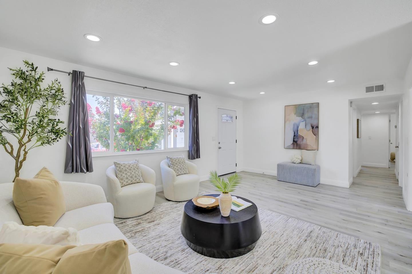 Welcome to your new home! This remodeled home boasts fresh exterior and interior paint, a spacious, naturally-lit living room, and significant upgrades including double-pane windows, waterproof vinyl flooring, and recessed lighting. The kitchen shines with new countertops, backsplash, self-closing cabinets, and stainless-steel appliances. Both bathrooms are updated with new vanities, fixtures, toilets, a standing shower in one, and a brand-new tub in the other. Open and bright primary suit. The backyard is ideal for entertaining with three large persimmon trees and a large patio. Located near shopping centers like Lion Plaza and Grand Century Mall, as well as outdoor attractions like Raging Waters and Cunningham Lake. Easy access to highways 101, 880, 680, and 280 ensures a smooth commute. 2 car garage and room for several cars in the driveway.