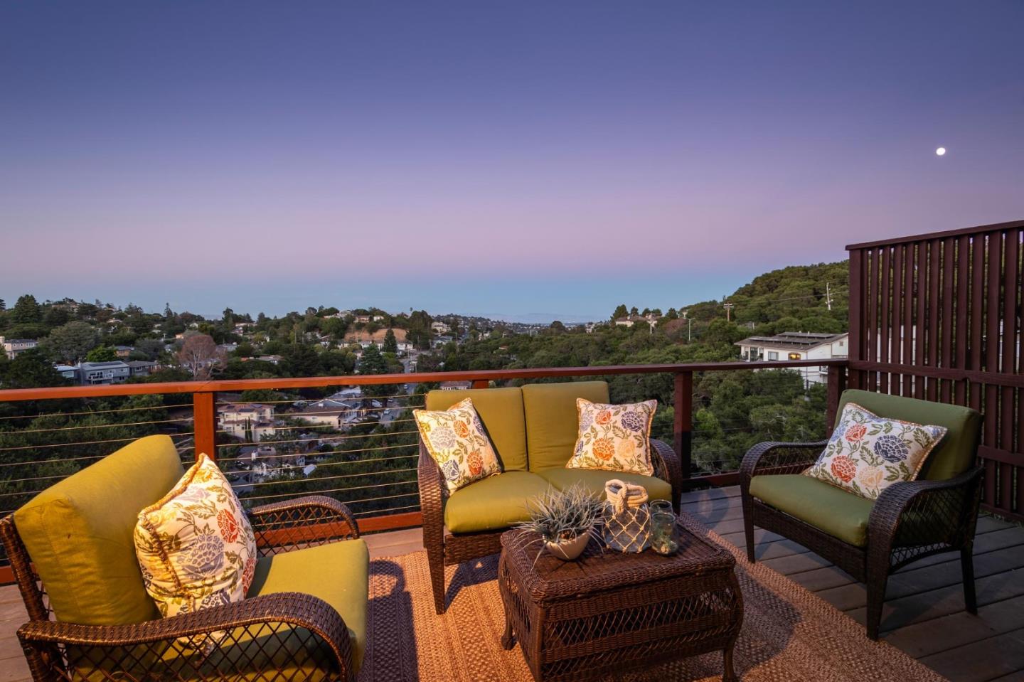 Belmont Hills home with panoramic hillside/skyline views - a true entertainer's dream! Grand entrance with wide double doors, high ceilings, and hardwood floors. The open kitchen/Great Room features a wood-burning fireplace and direct access to the wrap-around deck. Remodeled kitchen with double oven, a large window with stunning views, glass-front cabinets, and generous cabinets/pantry. Formal dining room and living room, with its own fireplace, offer unobstructed views and direct access to the wrap-around deck for the most engaging indoor-outdoor flow. The lower level includes a versatile bonus/recreation room with a wet bar, beverage fridge, wine rack, shelving, and cabinets. Updated half bath and organized laundry room with new vinyl floors. Two bedrooms with views and updated bathroom. The primary suite with spectacular views, an ensuite, and three closets. Features include a new roof, owned solar panels, updated electrical, remodeled kitchen, new flooring. Attached 2-car garage with interior access. Outdoor enthusiasts will love nearby hiking/biking trails, and convenient access to Ralston Ave/Hwy-92 ensures that urban amenities are just a short drive away. The area is known for excellent schools. Belmont Hills perfectly balances serene living with modern conveniences.