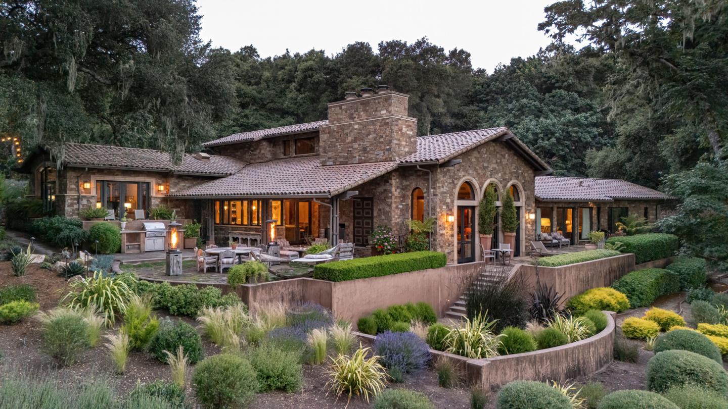 Located behind the secure gates of Santa Lucia Preserve, close to the Ranch Club, lies an old-world hacienda built with incredible materials sourced from all over the world. Crafted with repurposed beams from an 1800's New England farmhouse, vaulted ceilings soar above Colorado stone accents and milled Alderwood floors, and French doors throughout frame views of hillsides, valleys and meadows. This extraordinary property boasts a 3-bedroom, 3.5 bath main house, spacious kitchen with large island, dining bar and pantry ideal for culinary enthusiasts. A formal dining room adjoins the grand living room where a statement fireplace anchors the space, and the primary bedroom suite offers a relaxing seating area, fireplace and luxurious bath with soaking tub, outdoor-access stall shower and expansive walk-in closet. Multiple outdoor patios areas invite alfresco dining, relaxation and entertaining by the serene fountain or outdoor fireplace. The three-car garage has a fully appointed guest unit above which provides 2 additional bedrooms, full bath, and kitchen. With close proximity to the Ranch Club amenities that include the pool, tennis courts, fitness and equestrian centers, this home offers a lifestyle where you can embrace outdoor living, social activities and closeness to nature.