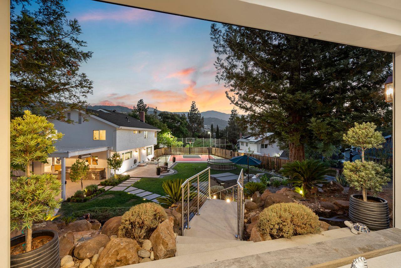 Nestled in Almaden Valley, this stunning 5-BR home epitomizes modern luxury and meticulous attention to detail. Step into the contemporary interior where the chefs kitchen is a culinary dream, boasting high-end Wolf and SubZero appliances, including a wine refrigerator and walk-in pantry. Walnut cabinetry, both polished & honed porcelain and custom butcher block counters enhance functionality and aesthetics. Dual Shaws of England fireclay sinks and Waterstone faucets add a touch of elegance. Throughout the home, 8" plank European oak floors create a warm ambiance, complemented by remote-controlled shades and exquisite lighting fixtures. The primary suite, complete with a spacious walk-in closet and a luxurious master bath features a generous soaking tub. Outdoor living is equally impressive, with a backyard that rivals a private resort. Enjoy a basketball court, spa deck, large pergola, BBQ area, firepit, and a dog run, surrounded by professionally landscaped gardens. A hilltop covered patio offers breathtaking views and is equipped with heating, a television, and remote-controlled shades for year-round comfort. Additional amenities include a 3-car garage, Tesla solar & battery backup, two storage sheds, and a tranquil hillside waterfall, completing this extraordinary retreat.