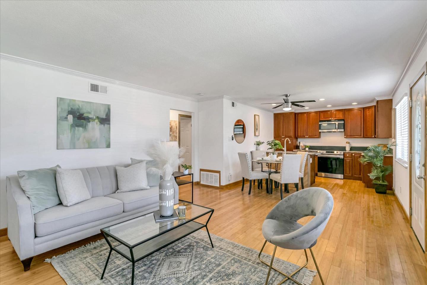 Remodeled Ground Level Unit with NO Upstairs Neighbors * Only One Shared Wall * Features include an Open Floor Plan * Lovely Kitchen with Custom Solid Wood Cabinets and Granite Counter Tops, large sink and pantry cabinet * Upgraded Luxury Appliances include a new side-by-side Refrigerator, Induction Range and Oven, built-in Microwave, Disposal and Dishwasher * New Air Conditioning Unit * Bamboo Floors and Trim * Remodeled Bathroom * New Furnace * Ceiling fans in dining area and bedrooms * Laundry Hook-Ups in Unit and Common Area laundry facility too * Garage Parking and Large Storage Closet * Community Pools * Near Parks and Easy Freeway Access