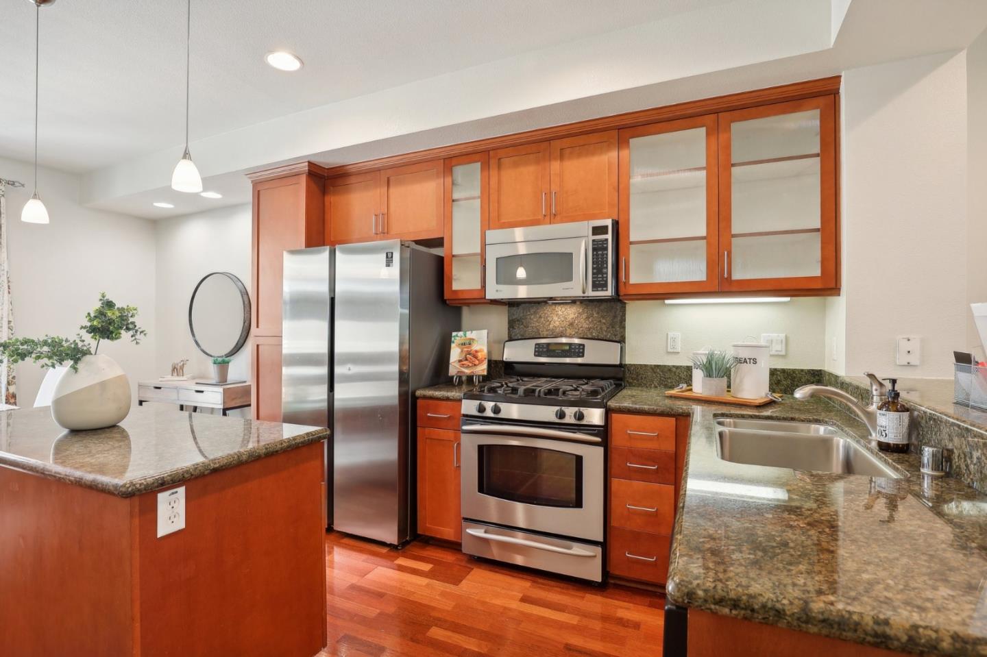 This well-maintained townhome, with its low HOA dues, is nestled in the picturesque Mariani Square community, renowned for its lush greenbelts, architecturally distinctive brick buildings, and the iconic Mariani Cannery Tower. The popular open-concept design highlights a Chef's Gourmet kitchen, complete with a gas range, stainless steel appliances, granite countertops, and a large island for additional prep space. The spacious living and dining areas are perfect for entertaining. Both bedrooms are ensuite, each featuring a private bath. The primary suite includes a walk-in closet, an oversized shower, and dual sinks, while the second suite offers a spa-like soaking tub. Recent updates include new carpeting and fresh paint touch-ups. Additional features of this home include dual-pane windows, recessed lighting, an abundance of natural light, and a 2-car garage. Situated in the vibrant Japantown neighborhood, this townhome provides easy access to trendy restaurants, farmers markets, bars, coffee shops, and more, along with convenient commuter routes, major employers, and all the amenities the Bay Area has to offer.