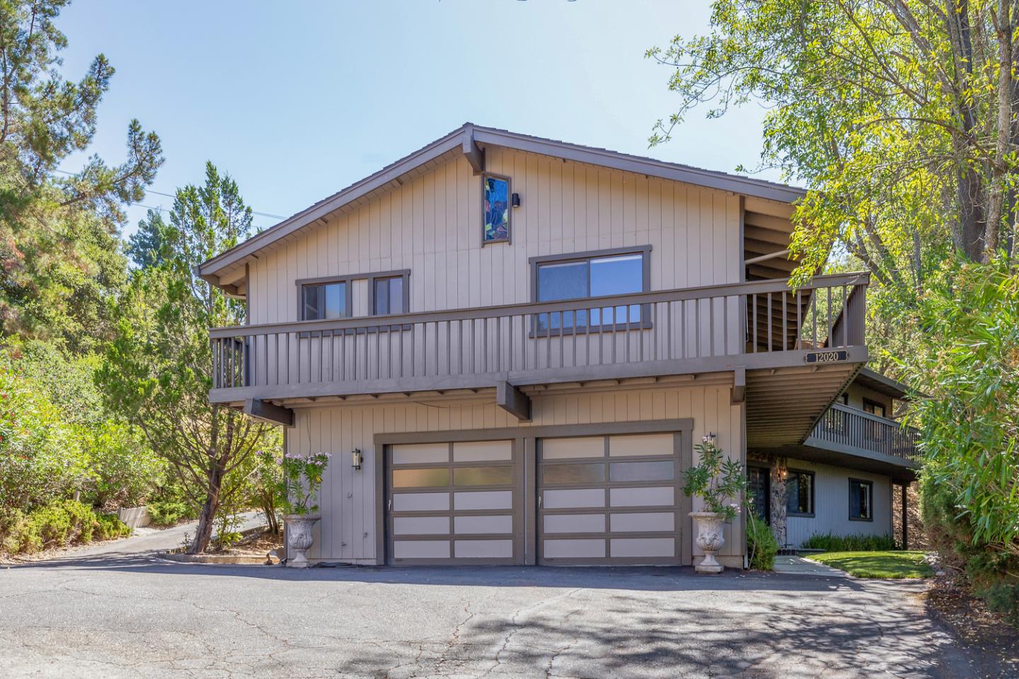 Sitting on one acre at the end of a private cul-de-sac, this spacious home offers soaring vaulted ceilings, picture windows, and a fabulous deck that wraps around the home and offers plenty of space for outdoor living and entertaining with views of the prolific surroundings. On the main level, the living room has a to-the-ceiling stone fireplace and lofty ceilings. The dining room has an upgraded wagon wheel chandelier and vaulted ceilings. The kitchen offers deep granite countertops, full-height backsplashes, and a large casual dining room with doors to the balcony. The family room offers even more living and entertaining space with built-ins and a focal-point fireplace. The primary suite opens to the balcony and sits beside a well-sized bedroom, and three additional bedrooms are privately situated on the lower level. The deck extends around the home and overlooks the lush hillside, mature trees, and the western hills. Exceptionally private, yet just minutes from downtown Los Altos, major commute routes, shopping, and dining.