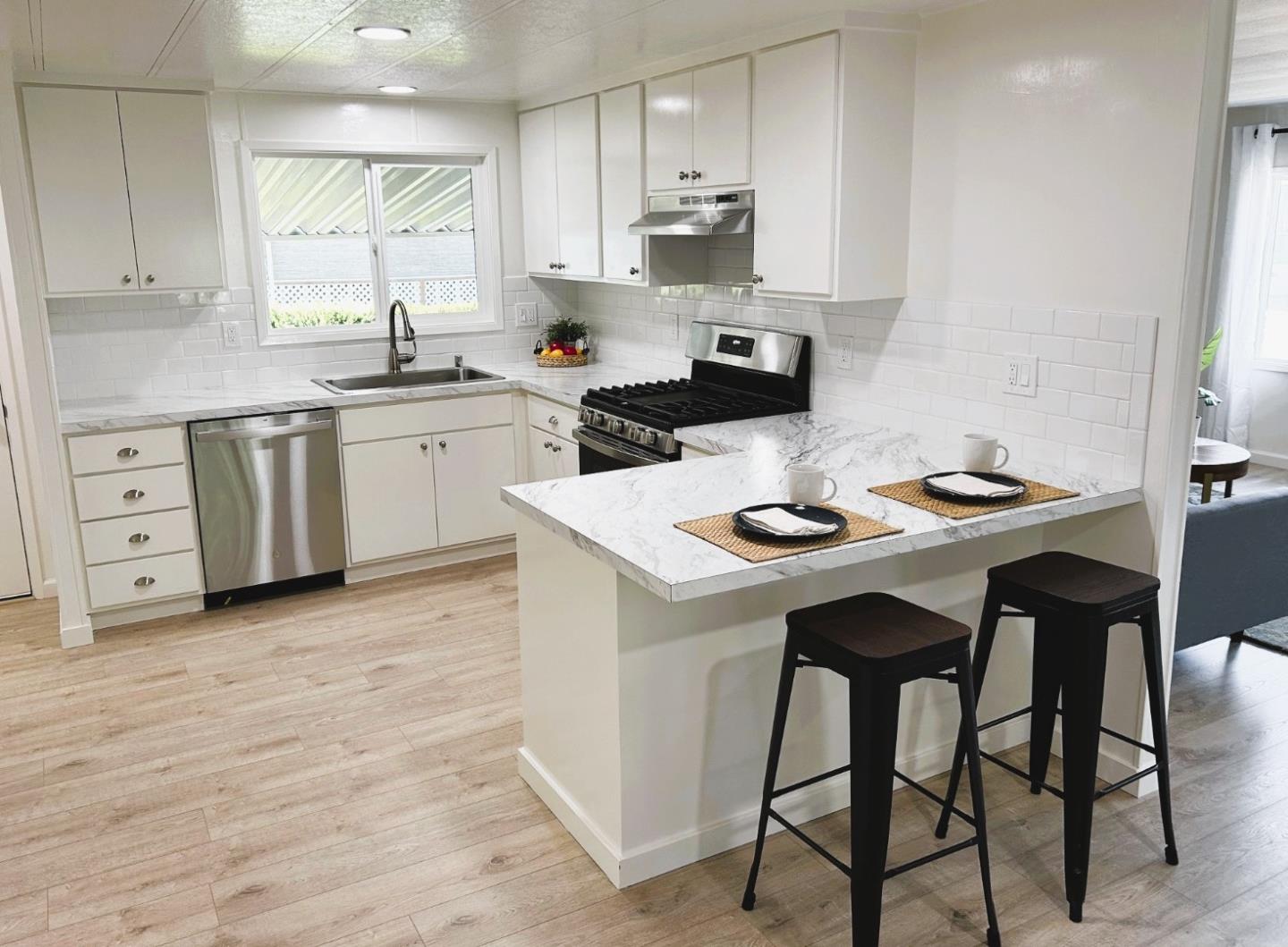 Beautiful mobile home! No property taxes! Low Space Rent! Check out this stunning kitchen with all white cabinetry, stainless steel appliances, and charming breakfast bar for two additional guests. The living room is spacious with large windows for great light. Gorgeous laminate flooring throughout and then warm carpet in the bedrooms. Two bathrooms with light gray cabinetry, shower and tub. Outside you'll find a large deck with a substantially large storage unit, perfect for an extra office or just storage. The deck is great for entertaining or a quiet evening. Just a quick walk to the community pool and club house. Located in the highly desirable Senior Park, Spanish Ranch Two. Buyers must be 55 years or older and qualify at the park. Close to Bart & other public transportation. Space rent $805/month.