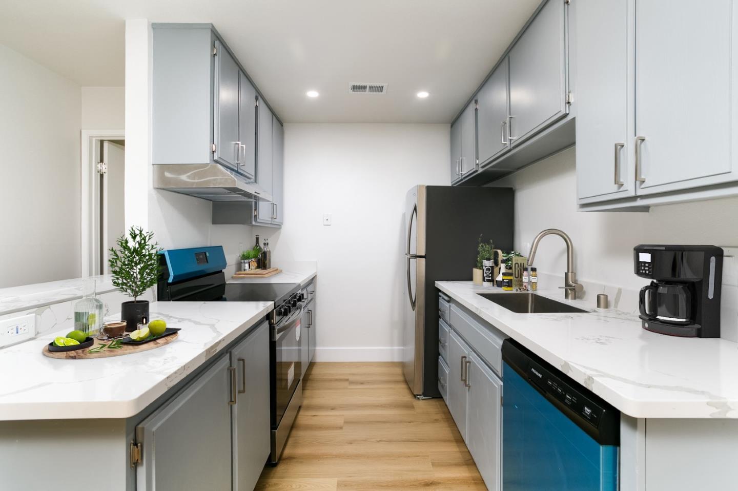 BEST VALUE IN MISSION GROVE! Beautiful, newly remodeled, downstairs, end-unit condo in gated community! The brand-new kitchen includes sleek stainless steel appliances, cabinetry and gorgeous countertops. The spacious living room opens to a private, enclosed patio. The brand-new bathroom is exquisite with new cabinets, marble-style countertop and bath surround, and frameless shower door. The modern design is complete with recessed lighting and luxury vinyl flooring. The efficient heating and cooling system provides year-round comfort. The low HOA dues include use of the sparkling pool, fully-equipped gym, and multi-purpose hall. The grounds are well-maintained and security is on-duty nightly. Convenient to neighborhood shopping, dining. Just 3 minutes to neighborhood shopping including Target, Walgreens, Five Guys, and more. Just 12 minutes to Japantown, San Jose State University, and San Jose International Airport. Easy access to major employers, highways 680, 101, 280, and 87 and all commute routes.