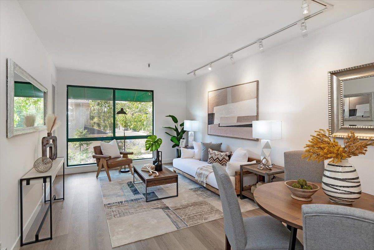 Escape into the hidden, resort-like complex of the award-winning Palo Alto Redwoods. The Redwoods is walking distance to all the conveniences and restaurants, yet you feel worlds away in this sanctuary among magnificent redwoods and lush landscaping. This one-bedroom, one-bathroom unit is in the secure and quiet back of the complex, with views of the western hills and adjacent to the Redwoods greenbelt. This tranquil oasis includes a community pool, spa and sauna, and guest parking. The condo has a dedicated secure storage unit and an assigned parking space mere steps from the buildings elevator leading to your front door. The condo has been tastefully updated with new, HOA-approved LVT hardwood-like flooring and new paint throughout. The remodeled kitchen offers sleek quartz countertops, new stainless-steel appliances, and a wine refrigerator. The spacious living room is versatile and stately with high ceiling and large windows allowing for an abundance of natural light. The spacious bedroom, 2 closets, peaceful private balcony, full bathroom with large vanity and linen closet, and washer, dryer and storage closet round out the convenience and comfort of this secret, secluded gem.