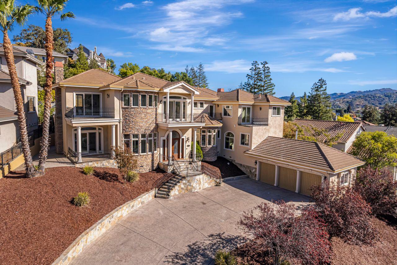 Stunning Almaden estate, ultimate in luxury living with breathtaking sunset & hill views and prime location in a lovely neighborhood. Bright & open, the living spaces are perfect for both relaxation & entertainment. Enjoy this home's warmth from the beautiful mahogany floors, new modern lighting, 3 fireplaces in liv|fam|primary, abundant natural lighting & views from almost every room in the house. The large chef's kitchen with walk-in pantry, Thermador appliances, new Bosch cooktop and dishwasher, quartz counters, breakfast bar & breakfast nook is a dream. Features include a grand entrance with spiral staircase, large foyer with wet bar, perfect for celebrations as well as a large office library, formal dining with beautiful crystal chandelier and spacious family room adjoining the kitchen. Upstairs enjoy a large conversation or play area, perfect for a pool table with a balcony to expand your indoor living to outdoors. 3 of 4 bedrooms have balconies and primary and junior suite both have walk-in closets and spacious bathrooms, 4 ensuite bedrooms with fresh paint in and out. With an oversized 3 car garage and spacious driveway & backyard with opportunity to design your own landscaping. This home is a rare find that perfectly blends elegance, functionality and great schools!