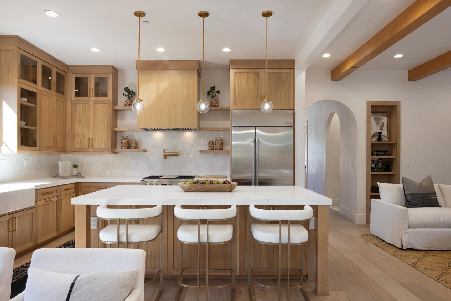 Located just a few blocks from downtown Carmel-by-the-Sea's world-class selection of restaurants, shopping, and idyllic beaches, this newly built modern home showcases the pinnacle of style and sophisticated charm. The home has stunning curb appeal with a covered front porch, stone-accented pillars, copper rain gutters, and beautiful landscaping framing the Olympic paver driveway. Through an arched doorway, you are greeted by an open floor plan featuring exposed beams, custom wood windows, built-in features, recessed lighting, and double sliding doors that open onto a gorgeous back patio with more Olympic pavers. The backyard offers low-maintenance landscaping, including a majestic Live Oak. Other highlights include 3 bedrooms, 3 bathrooms, a versatile ground-level 4th bedroom/office, European White Oak hardwood floors, and a luxurious primary suite with a soaking tub, marble shower, dual sinks, and radiant heated floors. The kitchen is a chef's dream, featuring a farmhouse apron sink with brushed gold fixtures, GE Monogram appliances, a built-in refrigerator, 5-burner range, and a wine refrigerator conveniently built into the island. To complete this exquisite property, a 5kw PAID solar system is included.