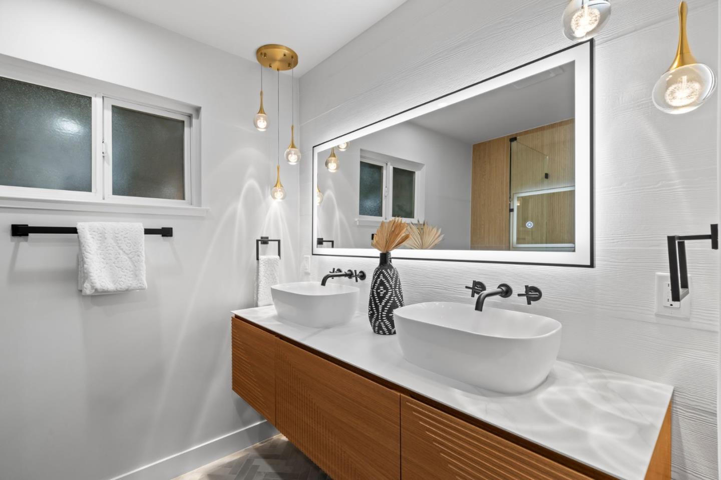 A rare opportunity on a large lot near the end of a low-traffic, tree-lined neighborhood street yet mere footsteps to the dynamic forthcoming Santana West mixed-use development and a short walk to Santana Row, this 3 bedroom (+ spacious office) / 2.5 bath single family home has been lovingly maintained in the same family for three and a half decades and professionally remodeled (with permits) with features and finishes typically seen in upscale new construction. The expanded master suite features a spacious bathroom with a floating dual-sink vanity, in-wall faucets, LED mirror with luxury pendant accent lighting, and a spacious walk-in shower with custom glass enclosure. The lavish hall bath could easily be mistaken as a second master bath, due to its exceptional size and designer finishes including a separate shower and free-standing soaking tub amidst floor-to-ceiling tile and modern dual-sink vanity with upscale lighting. Additional features include solid hardwood flooring and in-ceiling LED lighting throughout, a sprawling living room running much of the length of the entire home with modern skylights and slider access to the covered back patio for seamless indoor-outdoor living and dining, plus a bonus office space with slider access to the back patio and adjacent deck.
