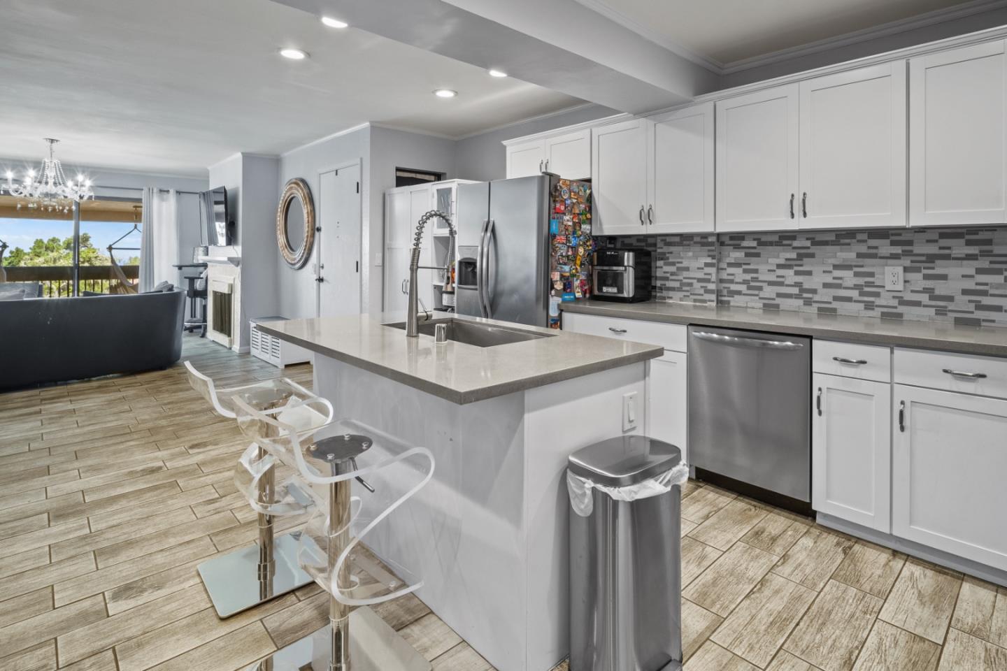 Welcome to this beautifully remodeled and oversized two-bedroom, two-bathroom condo with a versatile bonus room. This home is an absolute gem, offering a flexible floor plan with two master suites, each featuring full baths, dressing areas, and walk-in closets. Enjoy breathtaking panoramic views of Monterey Bay from this open-concept home where the kitchen, dining room, and living room flow seamlessly together. The modern kitchen is equipped with stainless steel appliances, quartz countertops, and recessed lighting. The bonus room, which includes its own entrance and a cozy gas fireplace, can be used as a bedroom, office, or family room. Additional highlights include elegant and easy-to-maintain porcelain tile floors, a gas fireplace in the living room adding warmth and charm, convenient parking in the same building, and laundry facilities also located in the building. HOA benefits include a heated pool (in summer), clubhouse, structure insurance, water, trash, and sewer. Located in a prime area with easy highway access, its just minutes from downtown Monterey and Carmel, and within walking distance to Del Monte Mall and Whole Foods. Situated in the sunbelt of Monterey, this tranquil and sunny location offers expansive bay views and city lights at night in a luxurious setting.