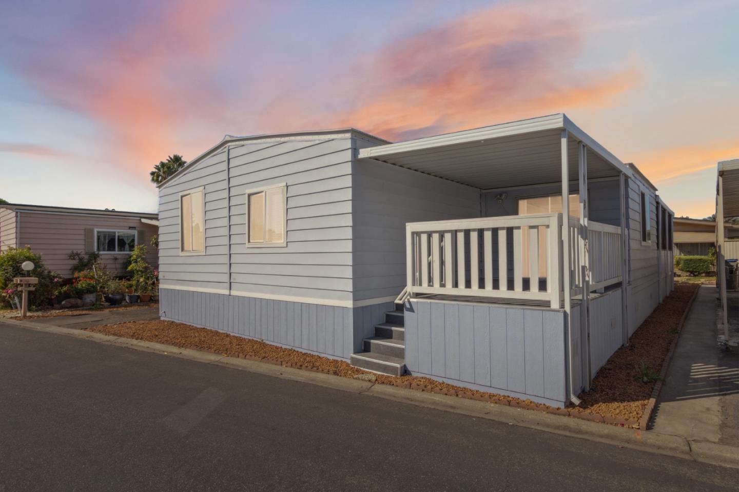 Welcome to this beautifully remodeled 3-bedroom, 2-bathroom modern mobile home, featuring high-end finishes, contemporary amenities, and a spacious layout designed for luxury and comfort. The open, bright, and airy space exudes sophistication and relaxation. Conveniently located in a thriving neighborhood, this home offers easy access to shopping, dining, schools, and parks, making it perfect for families and professionals alike. Start your day with coffee on the patio deck, and enjoy the charm of a fresh, airy sunroom with an indoor-outdoor feel. The open-plan living area boasts new stylish gray flooring, elegant baseboard, and crown molding. The kitchen, designed for cooking and entertaining, features stunning black granite countertops, white cabinetry, and all-new stainless steel appliances, including a gas stove, dishwasher, and refrigerator. Both bathrooms are elegantly remodeled with black granite countertops, white vanities, and modern LED mirrors. A dedicated office space and indoor laundry room offer convenience for work and daily tasks. Low Space rent ($1050). No property tax registration fee only $79 per year!! Actual Area = 1710 sq ft + 200 sunroom + 150 sq ft deck = 2060 sq ft. New AC Unit, New HVAC Unit, New Windows, New Flooring, New Kitchen and Bathrooms!