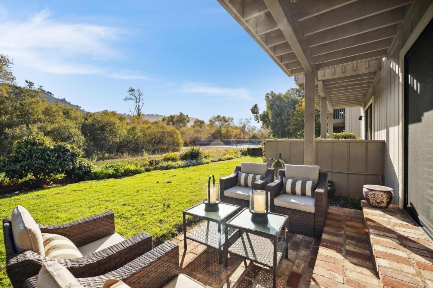 Welcome to your dream condo in the highly sought-after Arroyo Carmel community! This exceptional property is one of the few units that backs up to the green belt open space, offering breathtaking panoramic views of the Santa Lucia Mountains. Enjoy stunning sunsets from your private backyard or the balcony of the primary suite. This beautifully updated townhome features two generously sized bedrooms, each with its own ensuite bathroom, providing comfort and privacy. The entire unit boasts updated finishes, and the kitchen is a chef's delight with top-of-the-line appliances and custom cabinetry. Additional amenities include a spacious two-car garage, washer/dryer and new composition roof installed in 2023. The prime location offers easy walking access to a variety of excellent restaurants, grocery stores, and essential day-to-day amenities. Plus, you're just over a mile from the picturesque Carmel River Beach. Experience the perfect blend of luxury, convenience, and natural beauty in this exceptional Arroyo Carmel townhome. Don't miss the opportunity to make it yours!
