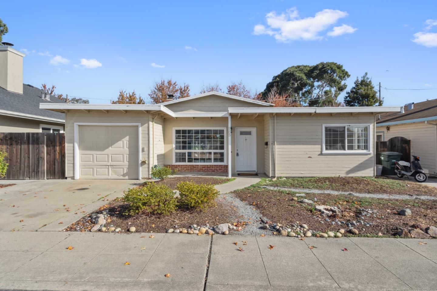 Opportunity awaits in San Mateo's Shoreview neighborhood! This home offers the perfect blend of character, modern updates, and the opportunity to further personalize to your own taste. The living room welcomes you with high ceilings, rich laminate wood floors, a picture window, and a cozy wood-burning fireplace with a carved mantle and built-in bookshelves. The dining room, featuring a chandelier and flows effortlessly to the backyard through a sliding glass door. The renovated kitchen is complete with white shaker cabinetry, black quartz countertops, a farmhouse sink, stainless steel appliances, and a modern vent hood. Three comfortable bedrooms include a front bedroom with wrap-around windows and two rear bedrooms overlooking Shoreview Park. All bedrooms feature ceiling fans and closet storage. The spacious backyard, with a concrete patio, is a blank canvas to let your creativity run wild. Additional highlights include a single-stall garage with laundry. Located near Shoreview Park, with its playground, skatepark, and courts, and close to San Francisco Bay Trail, Bayside/Joinville Park, and Coyote Point. Enjoy the best of suburban living while still being just minutes from downtown San Mateo and Burlingame. This home offers endless possibilities in a prime location!