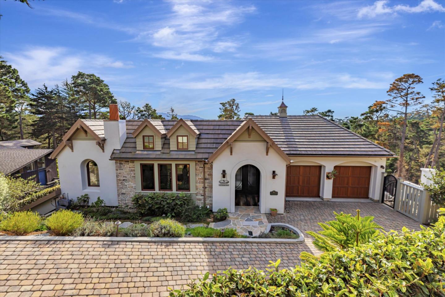Built in 2017 by its architect owner, this European-style country home in the prestigious Pebble Beach community was thoughtfully designed to maximize serene views of the Del Monte Forest and elevate outdoor living. Just 1/2 mile from the Pebble Beach gate, it blends timeless architecture with modern conveniences in a private yet accessible setting. The home features a large 702-square-foot primary suite on the main level, two en-suite bedrooms on the top floor, a guest bathroom, and inviting spaces throughout that exude comfort and elegance. A roughed-in elevator offers the potential for future accessibility, adding to the homes thoughtful design. Natural materials, including wood and stone flooring, add to the warmth, while Venetian plaster graces the interior walls, showcasing artisanal craftsmanship. Large windows frame unobstructed forest views, immersing you in natures tranquility, while wildlife sightings from the stone patio add to the sense of serenity. With seamless access to scenic walking trails, this unique property offers an unparalleled lifestyle in the heart of Pebble Beach.