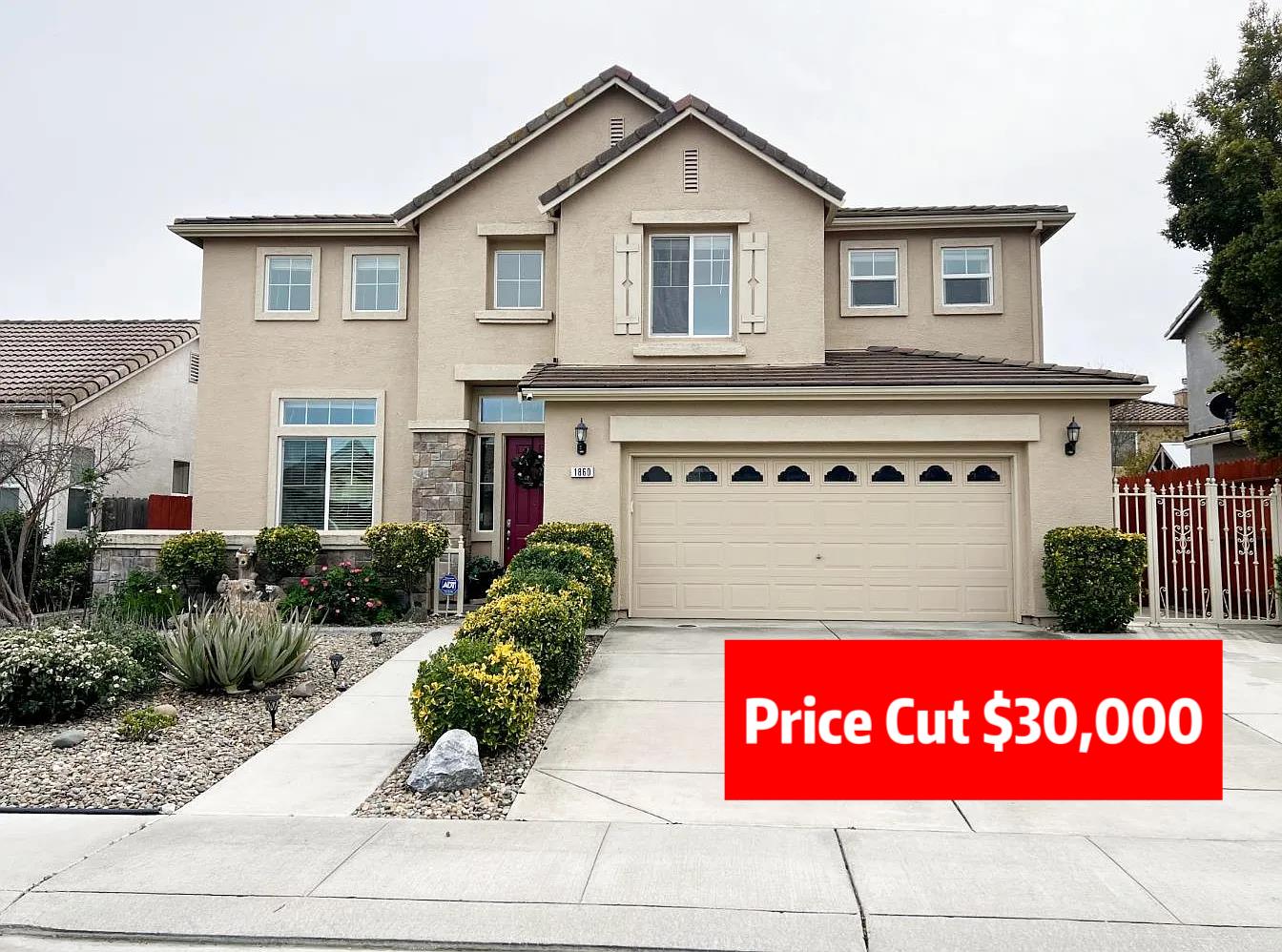 Price cut $30,000! Welcome to this stunning 5-bedroom, 3-full bathroom home that perfectly blends elegance, space, and comfort. Nestled in a desirable neighborhood, this two-story home boasts an open floor plan filled with natural light, soaring ceilings, and modern upgrades. One large bedroom and full bathroom downstairs perfect for guest and family members. The gourmet kitchen features granite countertops, ample cabinetry, a butlers pantry, and a built-in desk area, while the bright and airy living spaces include dual-pane windows, a cozy fireplace, and soaring ceilings in both the living and family rooms. Upstairs, the luxurious master suite offers serene yard views, a walk-in closet, and an en-suite bathroom, complemented by 3 additional spacious bedrooms and another full bath. Beautiful, water-efficient landscaping in the front and back yard, with a covered patio, outdoor kitchen, and slate flooring, surrounded by low-maintenance plantings, fruit trees. A small private front patio adds to the homes charm. Minutes from schools, parks, Costco, Target, and restaurants. Easy commute to UC Davis and Sacramento. With no HOA fees, freshly painted kitchen and bathroom cabinets, and newer 2-zone energy saving HVAC system, this move-in-ready home is a rare find in Woodland.