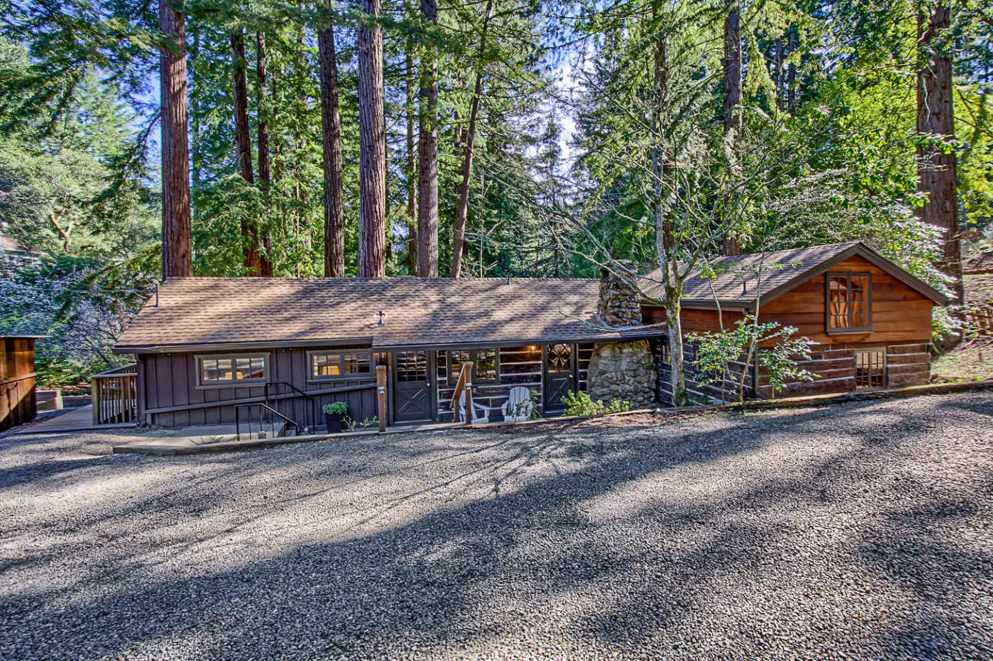 Located just steps from the famous Alices Restaurant, this charming cabin is a true retreat set amongst majestic redwoods on over half an acre. Offering a flexible floor plan with three bedrooms, two bathrooms, a very spacious living/dining room combination, and a kitchen with updated appliances. Walls and floors of rich wood carry throughout the home and are highlighted by expansive windows and high ceilings. The living room features a focal-point stone fireplace and sits beneath vaulted ceilings with handsome wood trusses. The dining room sits adjacent to the living room for easy entertaining with access to the deck. The kitchen is placed in the heart of the home with a center island topped in butcher block, tile countertops, a wood-burning stove, and a casual dining area. The primary bedroom has a wall of built-in storage plus two large closets, a sky-lit en suite bath with abundant storage, and sliding glass doors to the deck and spa. The secondary bedroom has a large skylight, a convenient sink, and a lofted area for even more living space. Outside, a vast deck surrounded by a majestic grove of redwoods has plenty of space to relax, and wraps around to a sunken spa off the primary bedroom. A cozy sanctuary, just a few miles away from the hustle and bustle of Silicon Valley.