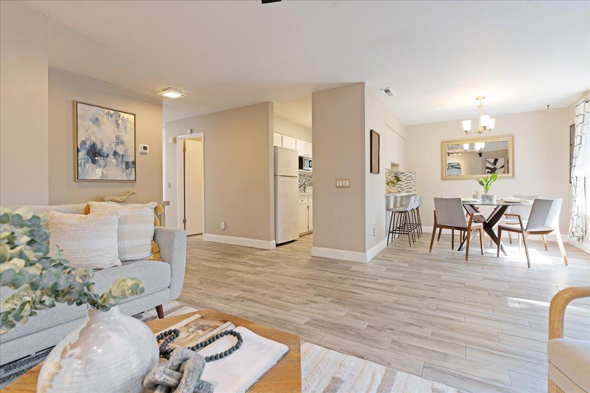 Discover this tranquil top floor condo in Scotts Valley, with a walkscore of 87. This move-in ready 2-bed, 1-bath condo is in the sought-after Village Green community just steps from Kings Village Plaza. This light-filled home with tasteful finishes offers privacy and serene, tree-lined views. Inside, enjoy a spacious living area that opens to a private balconyperfect for relaxing. The galley kitchen features ample storage and a dining bar, while both bedrooms provide comfort and quiet. Community perks of this 29-unit complex include a pool and hot tub, all in a prime location steps from Scotts Valley Library, shopping, middle school, and the fabulous Skypark. Hwy 17 access and transit is also a breeze for those commuting to Silicon Valley. This updated condo suits buyers seeking convenience and charm at a great price!