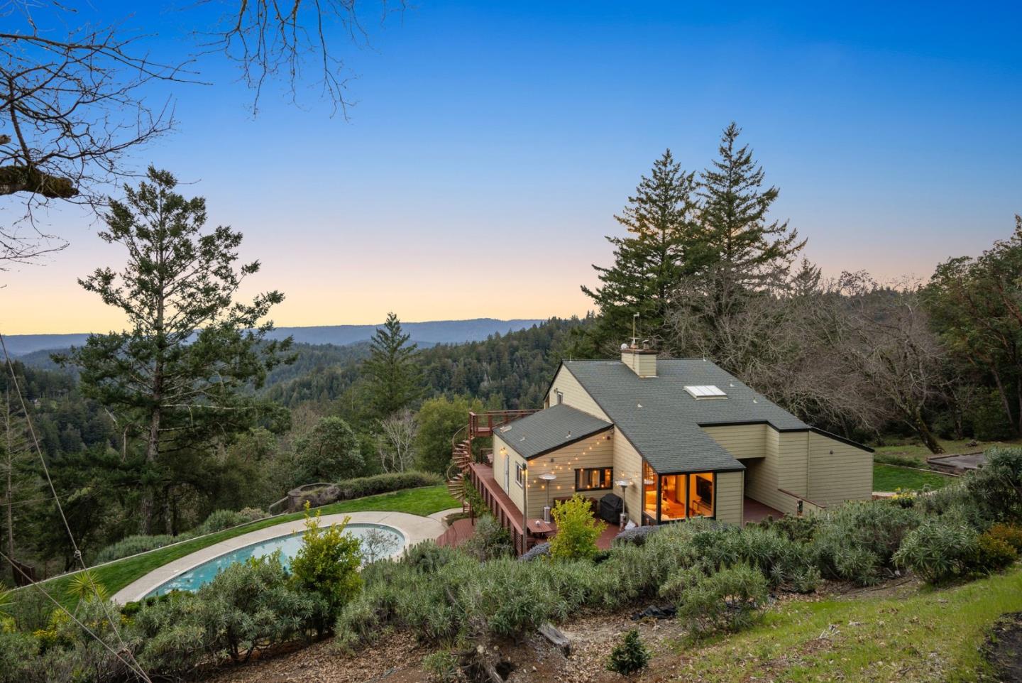 Welcome to paradise, a truly exquisite and private retreat in a park-like setting nestled on 41.2 stunning acres! Remarkable property offers total privacy and breathtaking mountain, canyon, forest, and ocean views! Arrive through the electric gate and be captivated by the beautiful rolling grounds, serenity and quiet. Formal entry greets you with exposed wood beams and site lines that draw you to the expansive floor-to-ceiling windows, filling the home with natural light. The elegant living room boasts a wood-burning fireplace, the gourmet kitchen is a chef's dream with stainless steel appliances, induction range, quartz countertops, and a pass-through serving counter leading to the formal dining area. The primary suite is a sanctuary with vaulted ceilings, two walk-in closets, and a spa-like bath complete with a soaking tub and large stall shower. With five bedrooms, four bathrooms, bonus room, this home offers ample space for relaxation and entertainment. New flooring, paint and light fixtures. Hardi-Shingle siding. Outside an entertainers paradise, pool, mulit-level decking, sitting areas, firepit, raised bed gardens, fruit trees, Axe throwing range. Trails throughout the property. Amazing sunsets! Easy commute location 10 min to town, Lakeside, CT English & Los Gatos High!