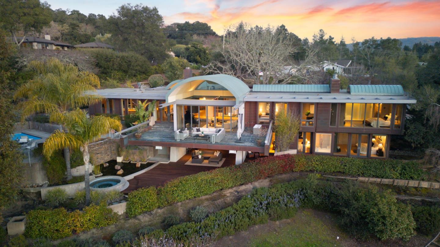 Just over 1 acre in central Portola Valley, this modernist masterpiece was designed by award- winning architect Arthur Dyson who worked with Frank Lloyd Wright. The Zen-inspired lifestyle has resort-like grounds and breathtaking Windy Hill views. A striking glass walkway continues inside, where a 2-story wall of falling water and all-glass staircase set a tone of modern panache. The organic ambiance continues with barrel-vaulted ceilings with glass at each end, copper wall accents, and floors in slate and maple. Living room, dining room, and family room offer seamless sightlines to a central cantilevered fireplace, entire walls of glass present the views, and the kitchen is equipped with top-tier appliances. A private office plus main-level primary suite with additional office space cater to remote work needs. Second bedroom and bath on main level plus 2 bedrooms and bath on lower level. Pool, separate spa, plus vast open and covered decks. Excellent Portola Valley schools.