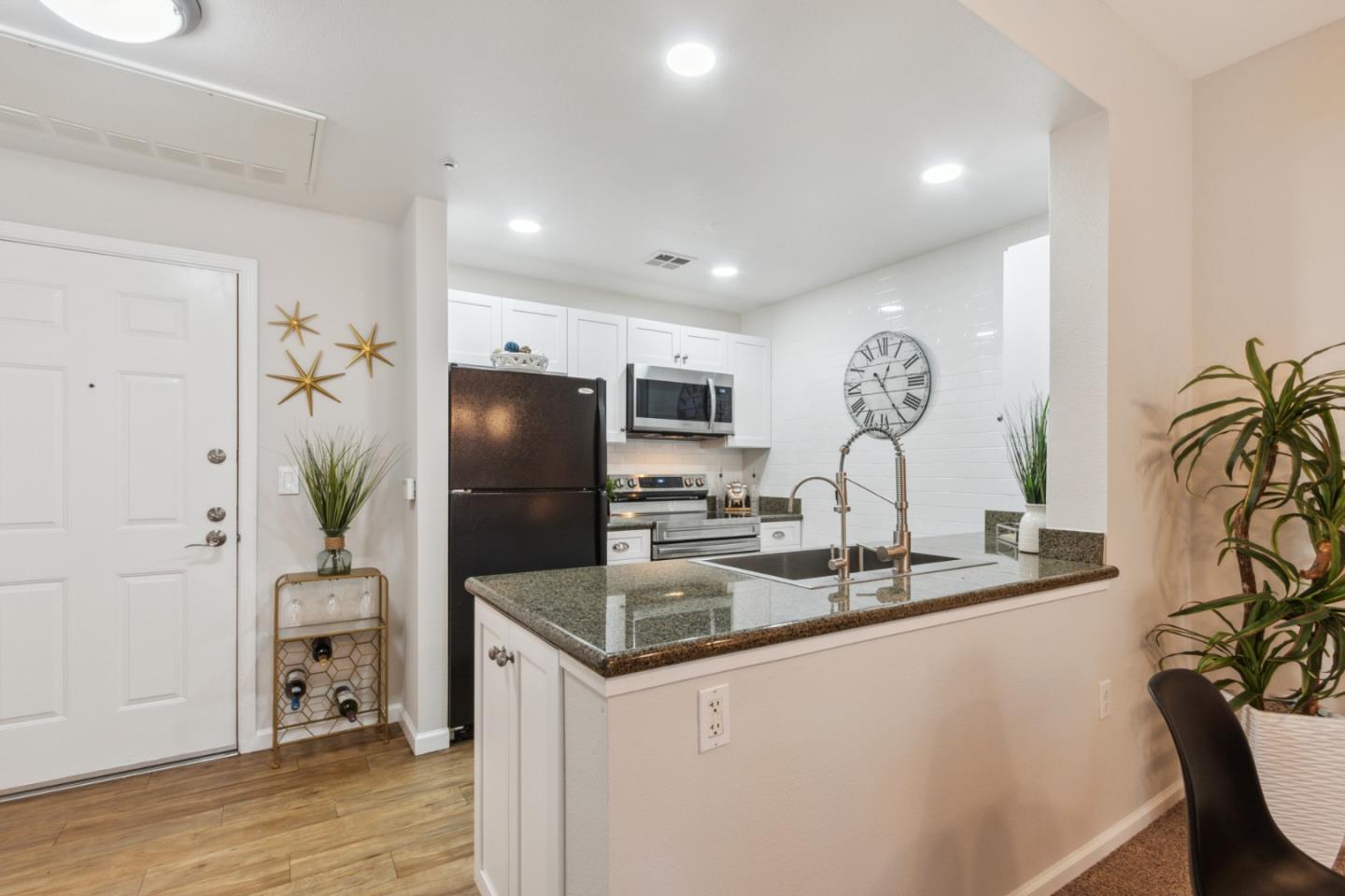 Experience luxury living in this beautifully remodeled 1-bedroom, 1-bathroom condo, perfectly situated in a prime location next to San Jose International Airport. Designed for modern comfort, this stunning home features an open-concept kitchen with stainless steel appliances, a sleek single-bowl sink, and a modern white backsplash that complements the elegant hardwood floors. The inviting living area showcases stylish wall paneling and a wide glass slider leading to a charming balcony, allowing natural light to pour in through double-pane windows. The spacious master bedroom boasts contemporary wall paneling, a walk-in closet, and in-unit washer and dryer for convenience. Indulge in the spa-like bathroom, adorned with rustic tile flooring and decorative stall walls, creating the perfect blend of sophistication and comfort. This is the ideal urban sanctuary for those seeking a stylish home in a highly desirable location. Jet-Setters 5 minute walk to SJ International Airport, Top Silicon Valley Tech Companies all around, dining, hotels close by, 2 exits down from downtown San Jose. Close to light rail transit, buses, Caltrain, Great America. Cities that are 5 to 10 mins away Santa Clara, Sunnyvale, Mountain View. Freeways HWY 101, HWY 880, HWY 87. Gated Community.