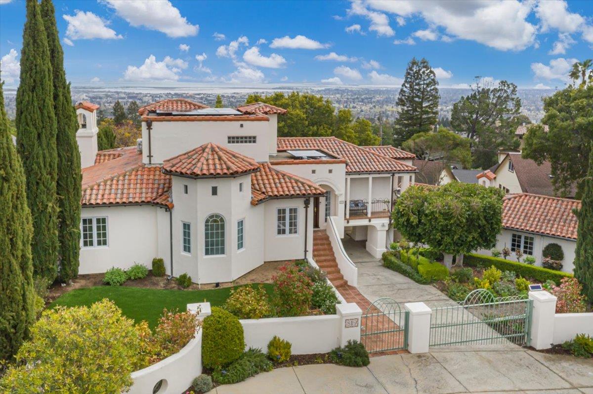 Welcome to this Magical Spanish Hacienda with private Casita! Situated on two parcels totaling 14,430 sq. ft., this home offers breathtaking bay views from the San Mateo Bridge to Stanford University. The elegant entrance includes a circulo de entrada driveway, copper-colored gates, and terracotta pavers leading to a classic stairway and arched wooden front door. Inside, enjoy a spacious gourmet kitchen with custom cabinetry, stainless steel appliances, and a large island with a secondary sink. Arched windows and hardwood floors add warmth to the space. The kitchen opens to a dining terrace with a built-in BBQ and sunshade, ideal for al fresco dining. The living room, with a fireplace and arch-framed windows, offers beautiful backyard views. The main floor also includes two bedrooms and a marble spa tub bathroom. The top-floor retreat features a bedroom suite with a bath, walk-in closet, and a terrace with panoramic views. The lower level offers a second primary suite, spa bath with tub, and a bonus bedroom or office. The backyard includes a large lawn, landscaped perimeter, and a blooming Jacaranda tree. The Casita offers a full kitchen, stylish bath, and private outdoor patios surrounded by eucalyptus trees. A rare opportunity you must see in person. You will LOVE living here!