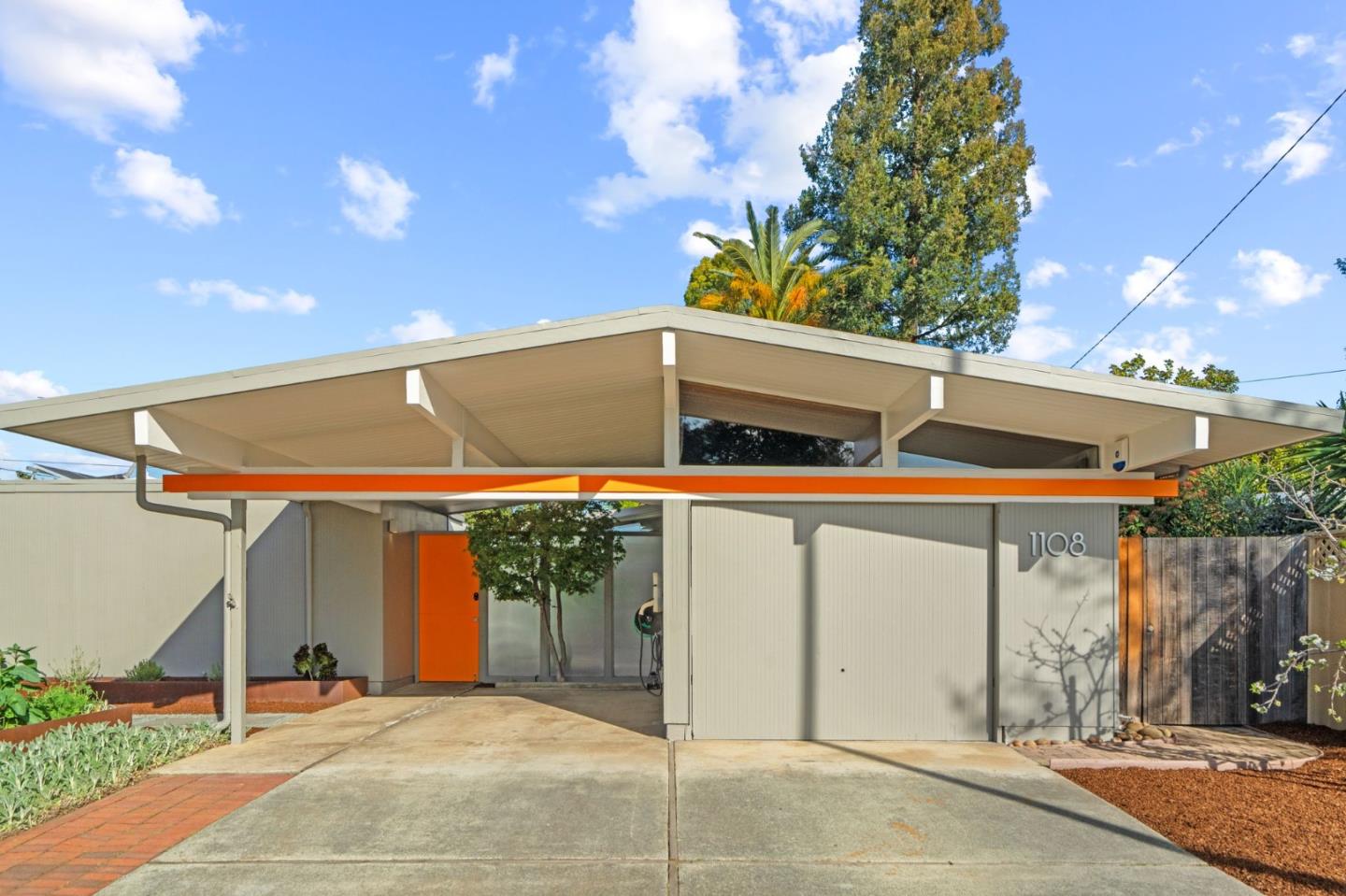 The central open air atrium, surrounded by floor-to-ceiling panels of glass, acts as a focal point and one of the most unique architectural elements of this home. Also special to this model are panels of privacy glass that run along the hallway wing. In this layout the kitchen sits in the middle of the home, flanked by the living and dining area on one side and bedrooms on the other. The eat-in kitchen features granite countertops, spacious island with breakfast bar and adjacent family room. The roofline is slightly pitched over the center of the home, highlighted by natural stained tongue-and-groove ceiling. The open living and dining area has sliding door access to both the backyard and atrium. The primary bedroom has a newly remodeled ensuite bath and walk-in closet. Radiant heated floors, plus mini split air conditioning units. Modern rusted steel framed planter boxes line the front yard. Several fruit trees: lemon, lime, mandarin, orange and fig. Brick paver patio, grass area, with even a climbing wall on the side of the house. Foam roof, EV charger and solar panels. Located in the coveted Fairbrae neighborhood with Cumberland Elem, steps to Fairbrae Swim & Racquet Club and Las Palmas Park. Minutes to El Camino Real amenities, downtown shops and weekly Farmers Market.