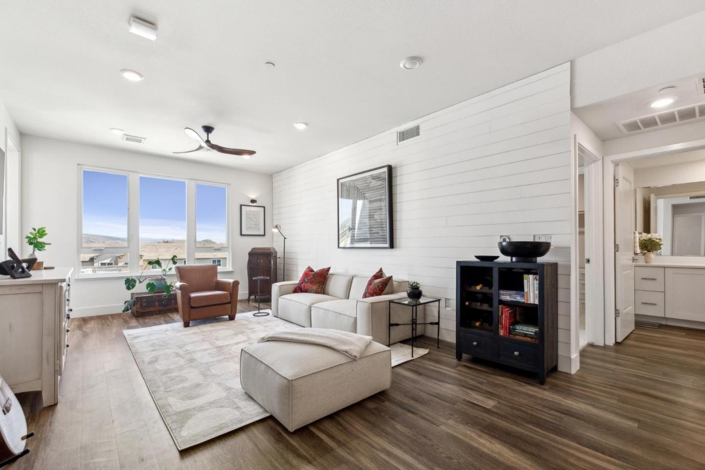 Top-Floor Upgraded Luxury Condo! Elevate your lifestyle with this beautifully upgraded, 2-BD, 2-BA home offering a generous 1,316 SF at the top of Avenue One. The open living space showcases a modern kitchen with quartz countertops and a marble backsplash that flows effortlessly into a sun-drenched family room. A newly added shiplap accent wall enhances the room's warm and inviting ambiance. Unwind on your private, covered patio overlooking the sparkling pool and spa. The dining area's rich walnut acoustic wood paneling adds warmth and style and is ideal for entertaining and quiet study. Both bedrooms are generously sized, with walk- in closets and hillside views. The primary suite includes a split bath, dual-sink vanity, and a roomy stall shower. Plush carpeting in the bedrooms complements durable, high-quality hardwood laminate flooring, combining comfort with easy maintenance. Other highlights include 9-foot ceilings, custom walnut ceiling fans, central A/C, and more! Enjoy unmatched convenience with 2 assigned parking spaces inside the gated garage with no adjoining vehicles, making entry and exit effortless. Resort-style amenities include a pool, spa, outdoor showers, fitness center, yoga studio, outdoor BBQ, and community room, plus remote smart home A/V security access.