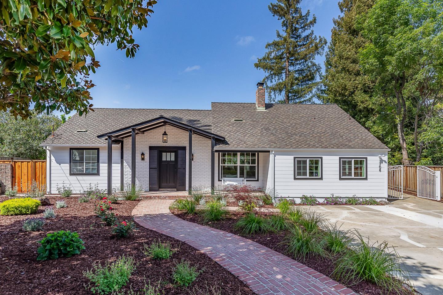 Tucked away at the end of an idyllic South Los Altos cul-de-sac, this designer home and ADU has been updated from top to bottom and is ready to enjoy completely as-is. The main house features 4 bedrooms and 2.5 baths, showcasing gorgeous wood floors, high-end finishes, and a neutral color palette that will complement any style of furnishings. The fabulous great room, bathed in natural light, seamlessly flows from the inviting living room, complete with front yard views and a charming brick fireplace, to the beautifully-appointed kitchen. Here you'll find white quartz countertops, gorgeous tile accents, and premium appliances. The open dining room, highlighted by a statement chandelier, provides access to the outdoors, where you have a private oasis for entertaining. The spacious primary suite retreat has a stylish en suite bath, and two additional light-filled bedrooms sit next to a full bath. An upper-level bedroom has a large closet, and could be an ideal office or playroom. Step outside into the meticulously manicured backyard featuring vast patio areas, a lush lawn, and a sparkling pool. The detached 1-bedroom, 1-bath ADU is equally impressive, with its own full kitchen, living area, and bathroom, an excellent space for guests, extended family, or as an income-generating unit