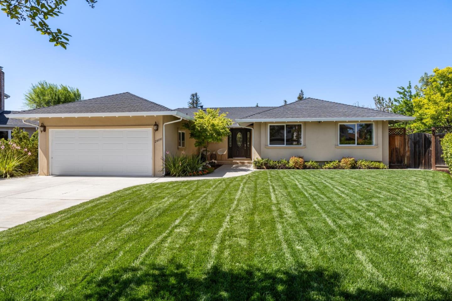 Welcome to this exceptional home nestled in a cul-de-sac in sought after Cupertino. Upon entering the foyer, the open floor plan greets you with abundant natural light, vaulted ceiling, and a lovely fireplace. The dining area features direct access to the spacious patio and large, newly landscaped yard with lush lawn and mature foliage. The tastefully updated kitchen boasts beautiful wood cabinetry, handsome stone tile backsplash, granite counters, ss appliances and a sunlit breakfast nook. Relax in the primary bedroom with outdoor access to the private patio and yard, and a walk in closet. The luxurious ensuite bathroom is an oasis with a jetted tub, separate tiled shower, and double sink vanity with elegant stone counter. The two bathrooms feature stylish new light fixtures, faucets and mirrors. Refinished, solid Brazilian cherry wood floors throughout, a freshly painted interior and crown molding add to the elegance of this home. Dual pane windows, a tankless water heater and central AC provide energy efficiency and comfort. Outstanding location just minutes to shopping, parks, the library, Apple Park, many high-tech companies and major commuter routes. All this, plus being a short distance to top-rated Cupertino schools make this a great place to call home!
