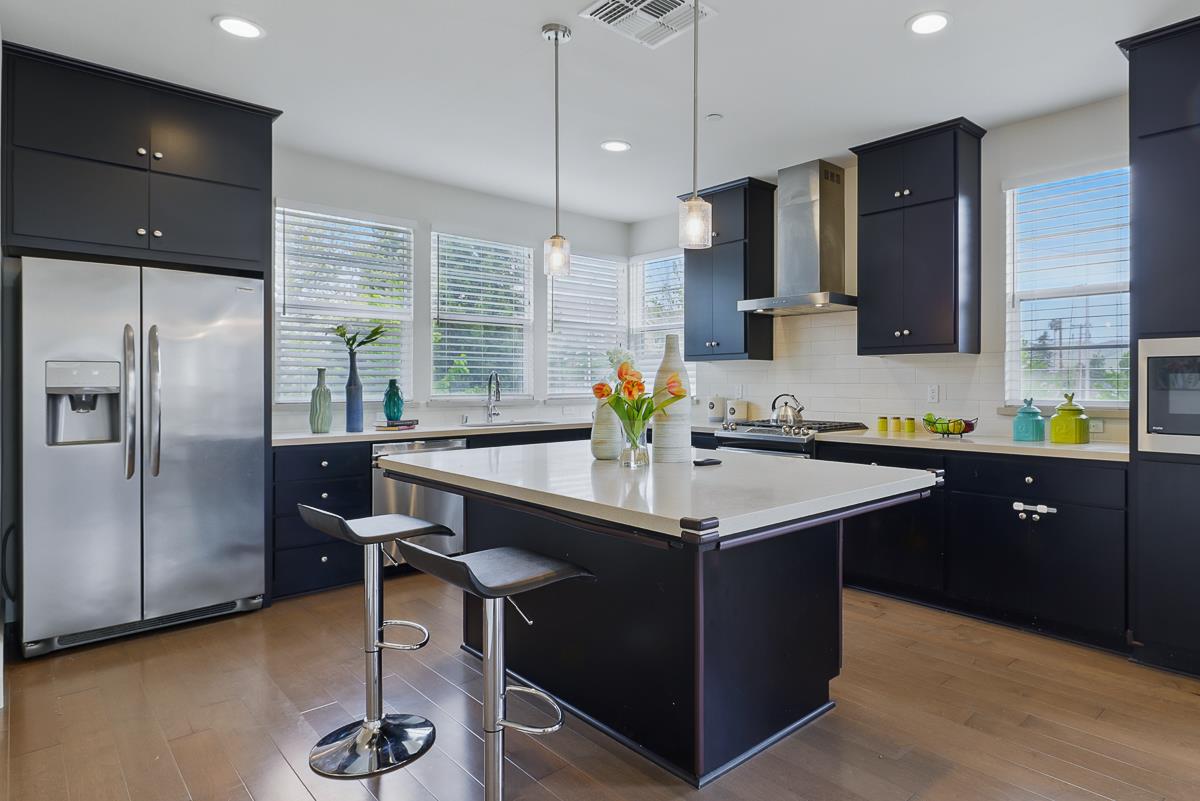 First time in market, Nuvera home built in 2019 in a quiet and sought-after Parkmont neighborhood. The home is North West facing, and features 3 bedrooms and 3.5 bathrooms with hardwood floor in the living area, corner unit, high ceiling throughout, lounging balcony, huge master bedroom with walk-in closet, En-suite guest bedroom. One more ensuite located on the 1st floor great for office, guest, or rental. The kitchen have branded stainless steel appliances, wide and deep sink, quartz counter top, large island makes perfect kitchen to entertain guest. Washer/dryer located conveniently on the 3rd floor. The home come with Triple zone heating/cooling controlled by smart thermostats, The community comes BBQ area, and with abundant guest parking and street parking. Centrally located in Fremont, within walking distance to dining, Philz coffee, whole food, Amtrak, Bart, Quarry lake, and top schools. Easy commute to use Highways 880/84. No Rental Restriction! Great starter & investment!