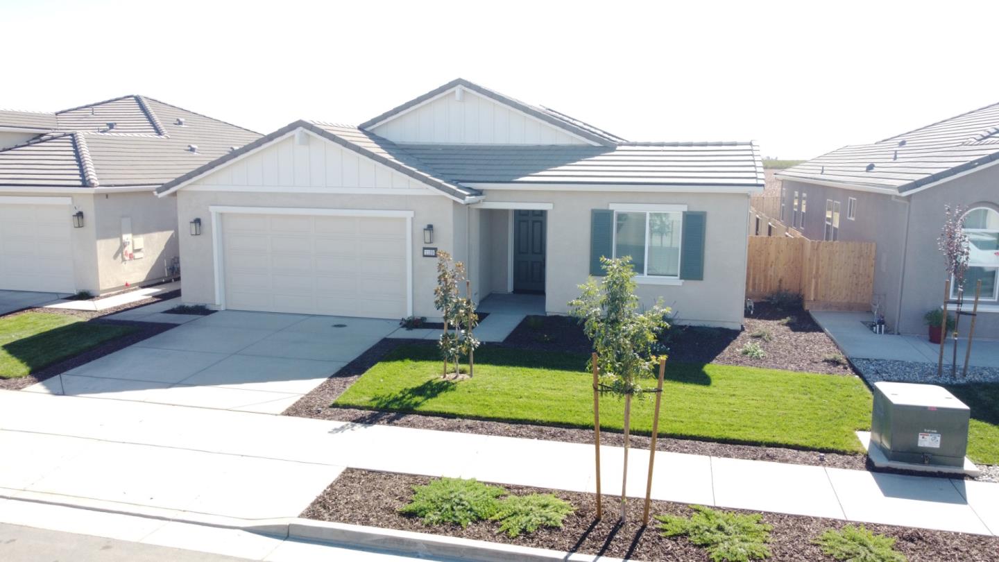 A wonderful blend of space, location, and efficiency. This beautiful turnkey single story house, built in 2023, is equipped with everything you need! As you welcome yourself into the home, you will notice the high ceilings and the large windows which allows natural lighting throughout the home. The heart of the home is the spacious gourmet kitchen, featuring upgraded quartz countertops, a spacious island, wood like tile flooring, Kohler fixtures, GE stainless-steel appliances, gas stove, and includes the refrigerator, washer & dryer. The primary suite has an oversized slider that leads to a fully landscaped backyard, perfect for morning coffee or evening relaxation. Efficiency and sustainability features include upgraded solar, electric water heater, and a water softener. This beauty is in a new community that is conveniently located near Hwy 5, parks, schools, and shopping.