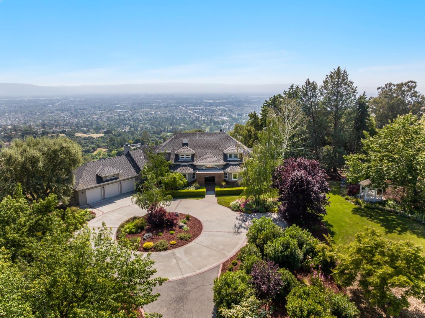 Discover elegant living in this gated estate on 4.4 acres overlooking Silicon Valley. This stately 3,972 sf home offers luxurious comfort with spectacular views from almost every room. The grand entry opens to a sweeping staircase and spacious interiors. The gourmet kitchen features granite counters, stainless appliances, cooking island, and access to a large covered deck with city-light views. Enjoy formal dining overlooking valley and canyon vistas. A spacious living room with fireplace and bow window complements the large, vaulted family room with stone fireplace and built-ins. A huge first-floor primary suite includes a private deck, office area, fireplace, dual vanities, jetted tub, oversized shower, and walk-in closet. Upstairs features 3 large bedrooms, each with walk-in closets, plus an updated bath with dual vanities. The lower level includes a second en-suite bedroom (perfect for an office), laundry, powder room, and wine cellar. Outside, meticulously curated gardens, fruit orchard, vegetable garden, gazebo, large lawn, and private putting green await. A 3-car garage, circular driveway, motorhome/boat parking, and solar system, offer abundant options. Potential for an ADU, pool, vineyard, tennis court, or additional garages. This amazing, must-see home is one-of-a-kind!