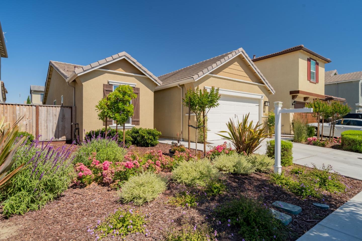 Better than new! Built in 2019, this 3 bed, 2 bath home features an ideal layout with stylish updates. The spacious kitchen offers granite counters, stainless appliances, a large pantry, and opens to the family room. The separate master suite is oversized with bright windows, a soaking tub, stall shower, and custom walk-in closet. Enjoy tile and solid surface floors, freshly cleaned carpet, solar, and an epoxy 2-car garage. The backyard includes turf and a covered patio, perfect for low-maintenance outdoor living. Front landscaping is maintained by the HOA, keeping the neighborhood looking its best.