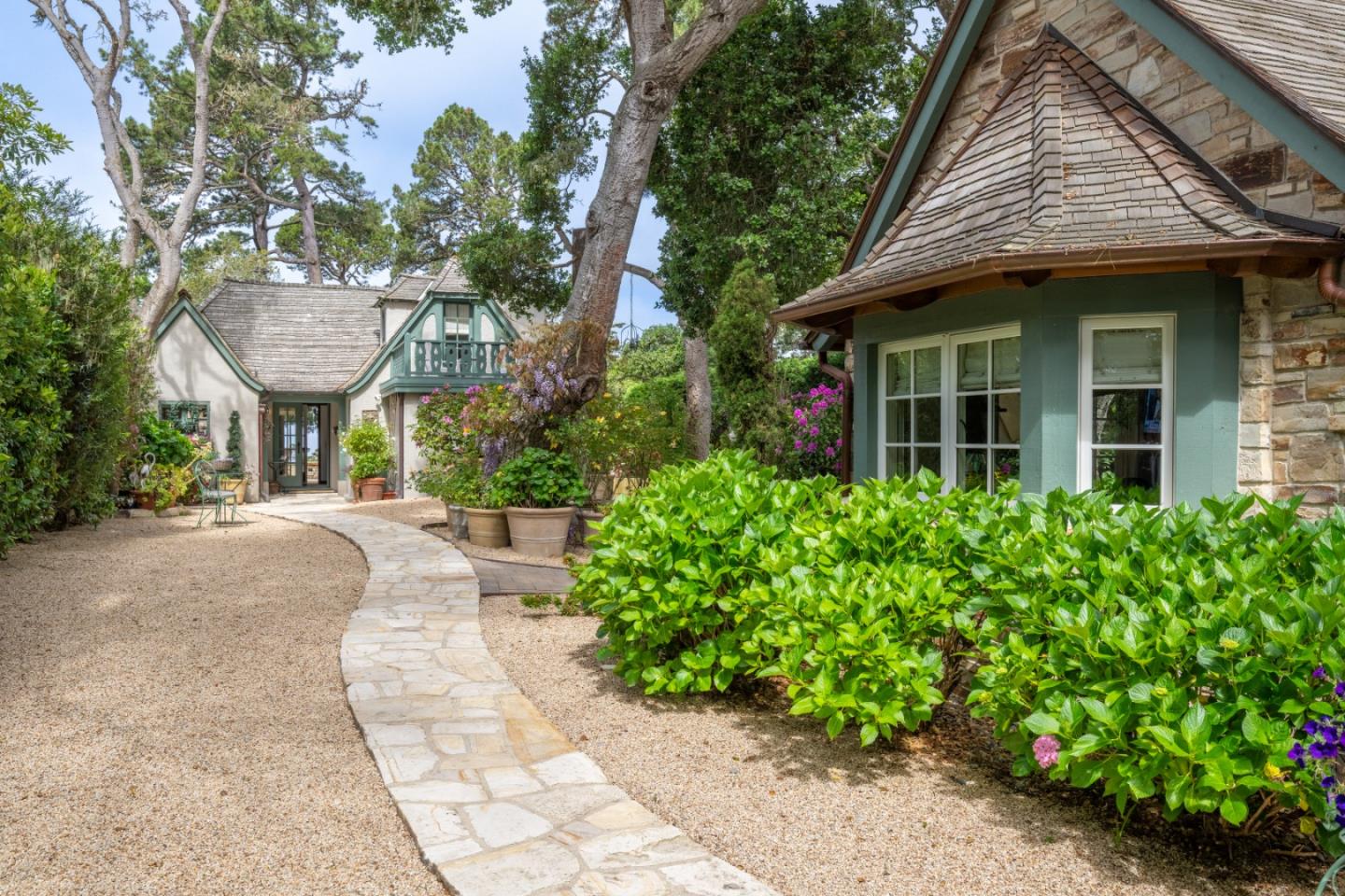 Curtain Calls ~ A Captivating Comstock Treasure in Carmel-by-the-Sea! An enchanting Comstock retreat beautifully situated among shaded trees, offering an alluring blend of historical charm and modern sophistication. Built in 1929, this dwelling stands as one of Carmel's most charming architectural homes, that exudes quaintness and charisma, making it one of the largest dollhouse-inspired homes in Carmel-by-the-Sea. Delight in the rustic elegance of the living room and kitchen, featuring a soaring wood-beamed cathedral ceiling, an inviting stone fireplace, and polished wood flooring. The property boasts a scenic outdoor retreat with two patios, both with ocean views, a Carmel stone fireplace and ample seating, ideal for both quiet reflection and lively gatherings. Situated on an expansive lot with picturesque landscaping, this home offers privacy and convenience in a walkable distance to town, making it a perfect union. A newly added separate guest cottage/ADU enriches the property for guests or for a revenue source. Don't miss this once-in-a-lifetime opportunity to own a piece of Carmel's heritage.