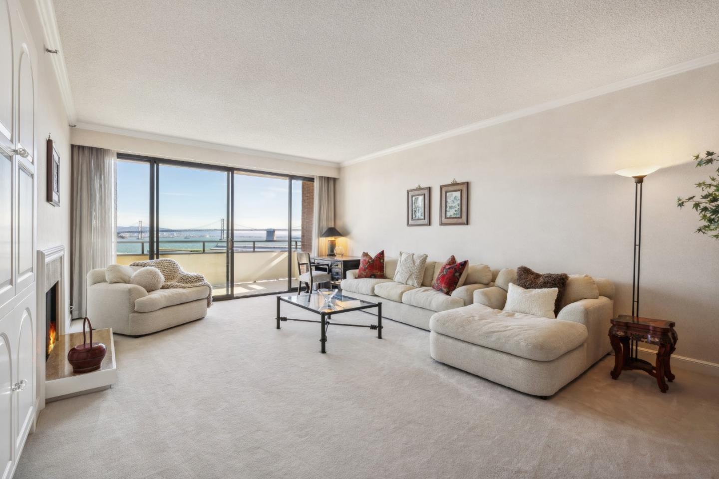 This sophisticated top-floor 2-BD, 2-BA residence offers breathtaking panoramic views of the SF skyline, visible from every room. This is one home you need to experience in person to fully appreciate. The expansive 1,544 sq ft floor plan is highlighted by soaring 9-foot ceilings, crown molding, and a cozy marble fireplace, creating an inviting and luxurious atmosphere. Floor-to-ceiling windows in both the living room and primary suite open to 2 private balconies, seamlessly extending your living space outdoors, with unforgettable views of Pier 29, Treasure Island, the Bay Bridge, and the Salesforce Tower. The kitchen, complete with like-new stainless steel appliances, including a SubZero refrigerator, flows into a dining alcove with chic pendant lighting. The primary suite offers an ensuite bath and an oversized custom walk-in closet with elegant built-ins for ultimate organization. A spacious 2nd bedroom, also with a large walk-in closet, enjoys its own stunning views. This well-maintained gem, rarely occupied since its 1987 purchase, includes a designated parking space conveniently located across from the garage elevator, along with additional private storage. Enjoy the added peace of mind with 24-hour doorman service, video surveillance, and a newly renovated lap pool & spa.