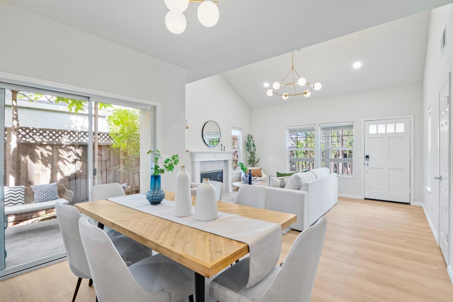 Discover this beautifully updated home in the desirable Mountain View neighborhood, built in 1998 and renovated in 2024. Step into a welcoming living room with a cozy fireplace, vaulted ceiling, and elegant pendant lighting. The open floor plan connects the dining area to an updated gourmet kitchen with quartz countertops, a stylish backsplash, new high-end stainless steel appliances, and sleek shaker cabinets. Sliding doors lead to the side and backyard, creating seamless indoor-outdoor living. A conveniently located powder room completes the main level. Upstairs, the spacious primary suite features a custom closet and a beautifully updated en-suite with a stall shower, marble countertop, new fixtures, and an illuminated mirror. Two additional bedrooms share an updated hallway bathroom. Other upgrades include new SPC flooring, modern lighting, and a new HVAC system. The home also has an attached two-car garage with a washer and dryer. Ideally located in Silicon Valley, it offers easy access to parks, markets, dining, and top employers. In the Los Altos High School district and near highways 101, 85, 237, 280, and Caltrain, commuting is a breeze. Don't miss this fantastic opportunity!