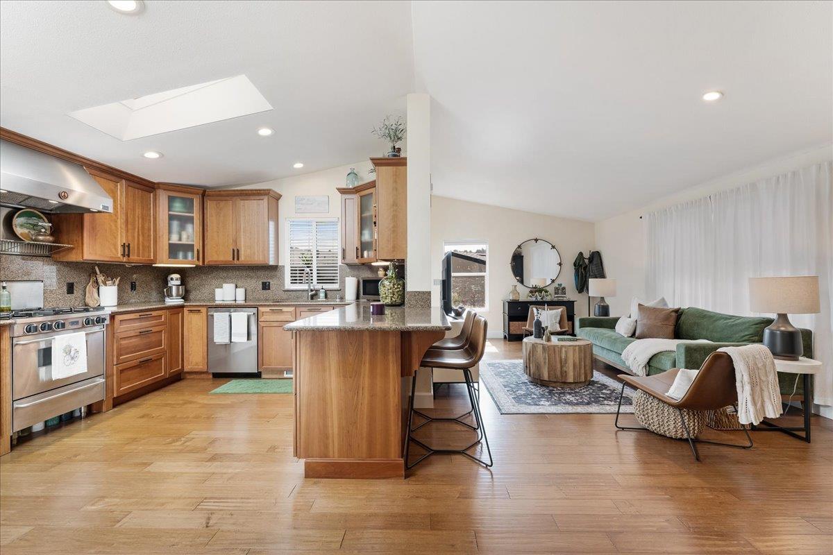 Welcome to Unit 23 at 999 Old San Jose Rd a rare gem peacefully nestled at the back of the community with no road noise and no neighboring units behind. Set between lush fig and avocado fields and bordering the scenic Anna Jean Cummings Park, this all-age community is surrounded by the rolling hills of Soquel, offering a daily connection to nature while being just minutes from the sand and sea of Capitola Beach. This well-maintained home sits in one of the most desirable locations within the park and benefits from Santa Cruz County rent control and management by one of the areas most respected property management companies. Enjoy sunny summer afternoons under the custom pergola or sip your morning coffee from the raised front porch featuring low-maintenance Trex decking. Inside, you'll find soaring vaulted ceilings and a beautifully appointed chefs kitchen complete with soft-close cabinetry, a premium FiveStar gas range, vent hood, and a generous walk-in pantry. Did I mention the new roof?! Whether entertaining or relaxing, this home offers both style and function. Convenient guest parking is located directly across from the unit, perfect for visiting friends and family. A perfect blend of quiet privacy, nature, and modern comfort this is Soquel living at its best.