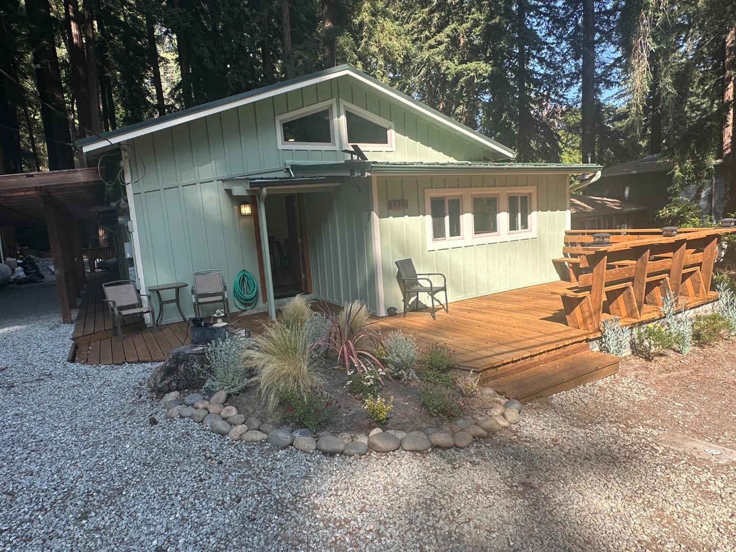 Sunny redwoods retreat on a level lot! This updated 2BR/1BA home includes an office + bonus room for flexible use. Features include a newer metal roof, whole-house generator, water filtration system, air conditioning, tankless water heater, updated kitchen and bath, and remote-control blinds. Freshly painted inside and out with hardwood and Saltillo tile floors. Relax or entertain on the front and back decks surrounded by nature. Convenient 2-car carport and in-home laundry. Located just 9 minutes to downtown Boulder Creek dining and shopping, and 28 minutes to Saratoga/Silicon Valley. Please access via Hwy 9 or Hwy 17 (not Bear Creek Road).