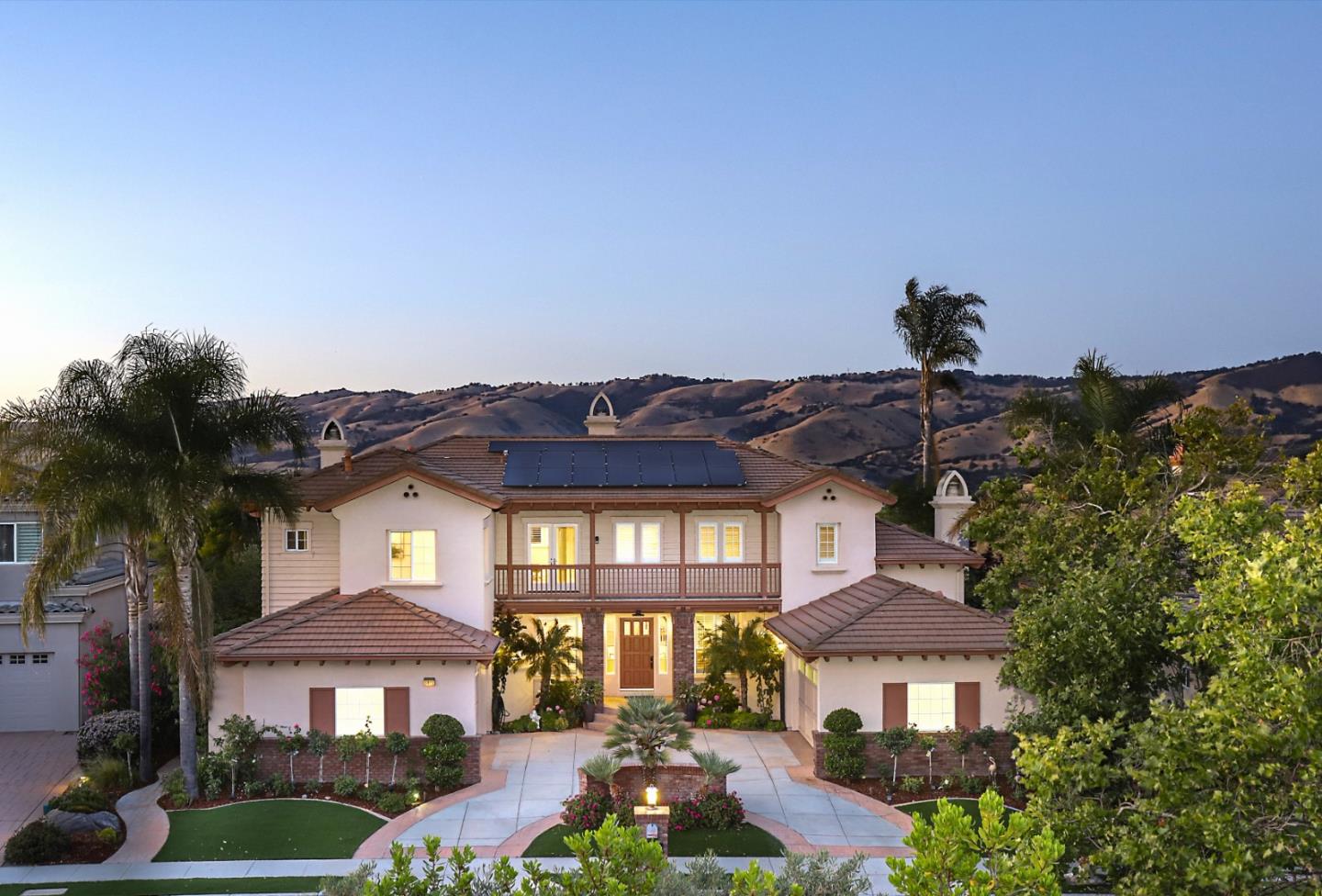 Perched on one of the highest elevations in the prestigious Silver Creek Valley Country Club, this elegant 5-bedroom, 4.5-bath home offers breathtaking views of the Mt. Hamilton Range, city lights, and the San Francisco skyline on a clear day. Spanning 4,173 square feet, the residence features exquisite craftsmanship, extensive custom millwork, crown molding and a thoughtfully designed layout. The gourmet kitchen features Thermador stainless appliances, a large center island with vegetable sink and upgraded fixtures. There is a spacious family room with a wet bar, a media room with wine cooler which can also service as an office and a downstairs guest suite with full bath. Sweeping views from the luxurious primary bedroom suite with retreat and office elevate everyday living. Recent upgrades include 10KW paid solar, engineered wood flooring, guest bathrooms with smart toilets and heated tile floor, fresh paint, recessed lighting in all bedrooms and updated switches and outlets. The entertainers' backyard boasts an outdoor kitchen with pizza oven, granite counters, stainless BBQ, a gazebo with heaters, in-ground spa with spillover and a gas fire pit. Newly finished four-car garage with epoxy flooring and EV Charging. Immaculate, upgraded, and move-in ready. Come and fall in love!