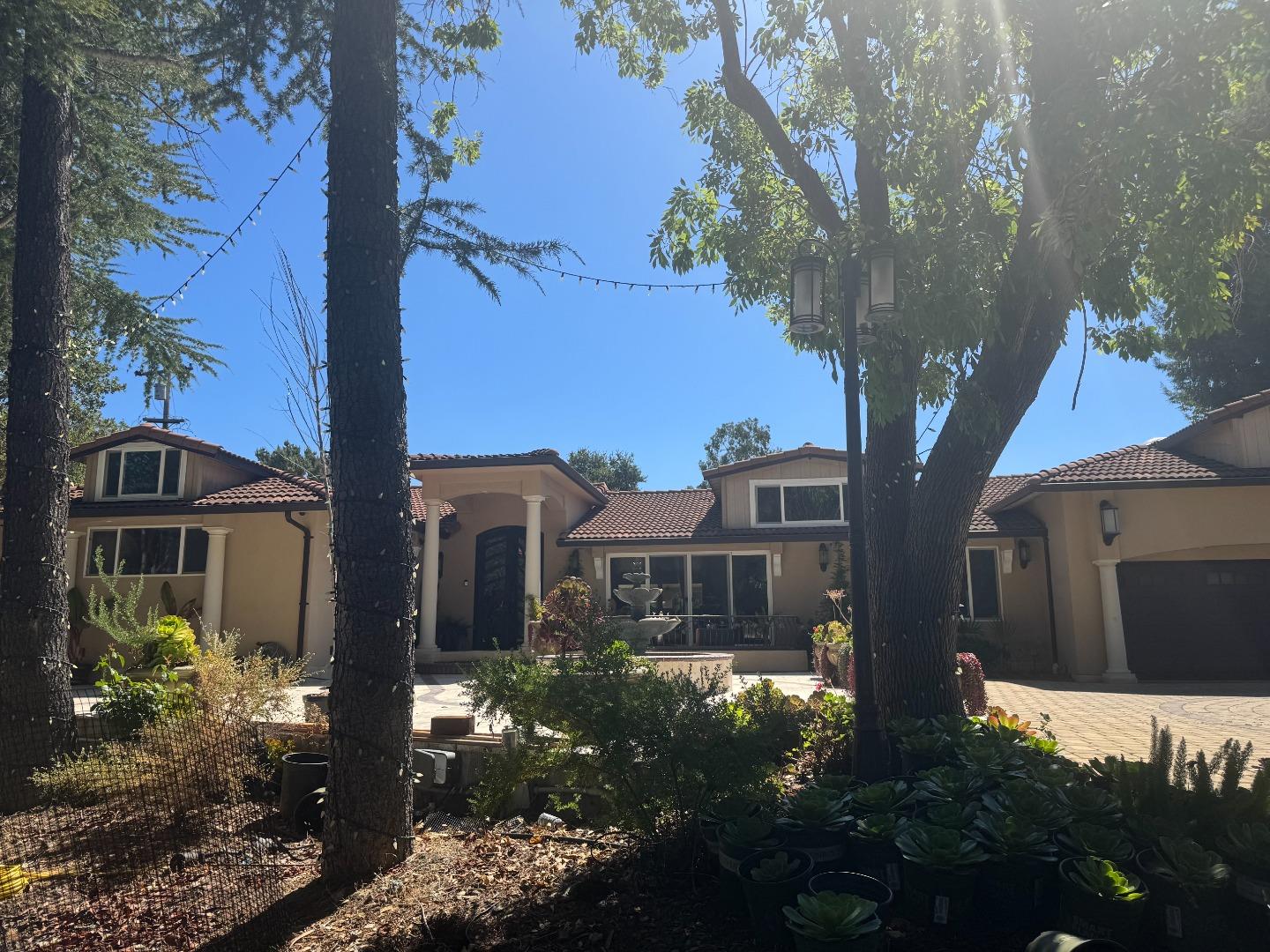 This stunning gated & fully fenced Saratoga estate mansion sits on a serene cul-de-sac, private & quiet minutes to freeway access. Featuring grand paved driveway, manicured landscaping, & striking modern Mediterranean elevation welcomes you with 9-ft entry door & skylit foyer. Security cameras surround the property, with recessed lighting & landscape lamps. Boasting 5 bedrooms & 6 bathrooms (3 en-suites), the open layout includes a spacious living & dining area, cozy lounge/office with accordion door & backyard views, dramatic kitchen/family great room with high ceilings. The chefs kitchen is outfitted with Thermador appliances, 2 ovens, 2 microwaves, 2 warming drawers, 2 dishwashers, 42x84 fridge, 2 sinks, premium cabinetry, 10-ft island with seating, 3 beverage coolers, & an accordion window opening to an outdoor bar. Enjoy a theater-style family room with 2 wet bars, a versatile upstairs loft/office/storage room, & a huge attic storage. The 3-car garage includes a full bath. Outdoor living has a large covered porch, soaring ceilings, fans, sauna, and a centerpiece theater-style viewing deck. The backyard features a pool/spa, tiled side yard, lush lower terrace leading to backyard & fountain, detached office/gym, & multiple storage sheds. 2 minutes drive to shopping & banks.