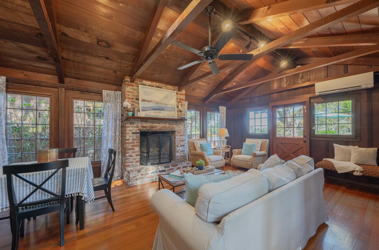 Looking for your next getaway? Inside this wonderfully unique property, you'll find board and baton wood walls, open beam ceilings, a brick fireplace, and windows overlooking the expansive yard and distant views of the Monterey Bay. Enjoy indoor/outdoor living with multiple patios/decks. Each of the two bedrooms has its own en-suite, making everyday living or vacation stays more convenient. With the new detached office/workshop space, working from home or having your own hobby room allows for flexibility. Move right in or explore the previously approved plans for a new two-story home with a garage. Located within the Pacific Grove Unified School District attendance area. See you soon!