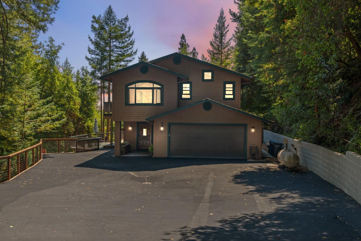Situated on just over two acres in the beautiful Santa Cruz Mountains, this 2,400 sq. ft. home offers 3 bedrooms, 2.5 bathrooms, and a lifestyle of elegance surrounded by nature and great views. Recently refreshed with new interior paint, light fixtures, and an epoxied garage floor, the home is fully turnkey with thoughtful updates throughout. The chef's kitchen features refinished cabinetry, sleek countertops, and a gas cooktop, ideal for preparing gourmet meals to enjoy al fresco on the expansive deck, where sweeping mountain vistas provide a breathtaking backdrop. Inside, the living room is defined by a stately wood-burning fireplace, creating an inviting atmosphere for both intimate evenings and sophisticated gatherings. The primary suite is a true sanctuary, offering generous closets and a serene space to unwind at the end of the day. A versatile bonus room enhances the home's appeal, perfectly suited for a private office, fitness studio, or creative lounge. Offering privacy without sacrificing convenience, this luxurious mountain residence is only minutes from boutique markets, charming shops, world-class outdoor recreation, and direct access to Highway 17.