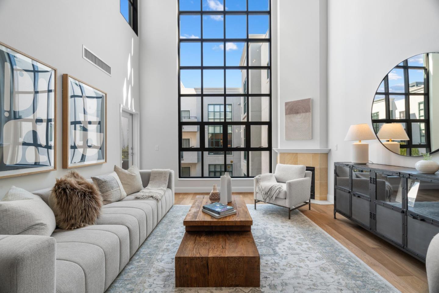 Sunny, bright & quiet! Gorgeous, updated two story townhouse style condo with NO SHARED WALLS and nearly 20ft ceilings. Two large en-suite bedrooms plus a bonus loft that could double as a family room, office, gym, possible third bedroom - endless possibilities. The unit features newer hardwood flooring throughout the main floor, new designer carpeting upstairs, soaring ceilings with tons of natural light, newer laundry units and appliances within the unit, updated kitchen, two private use decks, and large in-unit storage room. Beautifully maintained luxury building in the heart of downtown San Mateo with nicely appointed fitness center, two deeded parking spaces in a secure garage, and stunning common area courtyard. Vibrant urban living within just a few blocks of award winning restaurants, shopping, an Equinox gym, and CalTrain for easy access to San Francisco, Silicon Valley, and everything the Peninsula has to offer.