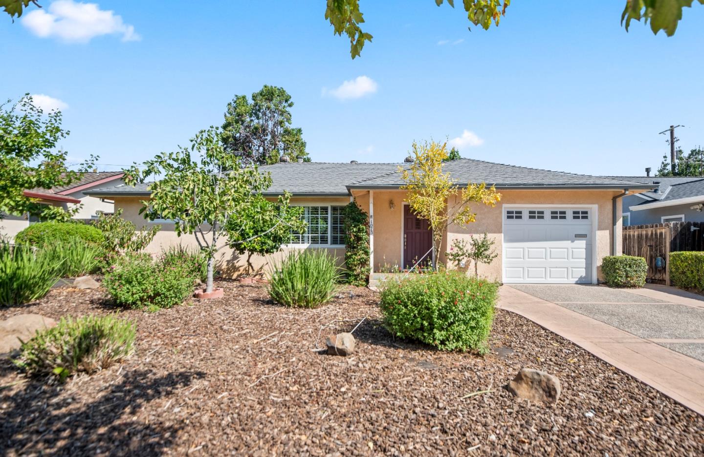 Charming home with true backyard oasis around corner from Cherry Chase Elementary! The living room welcomes you with natural light streaming through wide picture windows with views of the delightful tree-lined street. The kitchen features a peninsula with built-in wine storage & bar seating ideal for casual dining that flows into the dining area with glass doors opening to the backyard, perfect for seamless indoor-outdoor entertaining. Another peninsula looks into the spacious family room, which is well-suited for movie nights, relaxing with loved ones, or dedicated work-from-home space. All bedrooms thoughtfully placed in separate wing for privacy & quiet, each with generous closet space. Step outside to a spectacular backyard retreat featuring patio for seating, trellis draped in flowering vines, raised garden beds, pomegranate & fig trees, & serene babbling fountain. An attractive, low-maintenance front yard with pomegranate, peach, fig, apricot, tangerine, & lemon trees completes your outdoor sanctuary. Unbeatable location in the heart of Silicon Valley near major tech employers, close to commuter routes, & surrounded by upscale amenities. Plus, students have access to excellent schools in Cherry Chase Elementary, Sunnyvale Middle, & Homestead High (buyer to verify)!